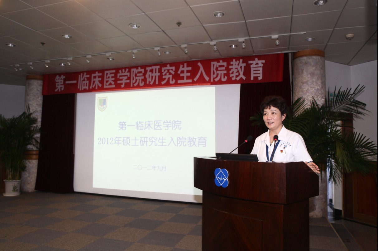 首先,王虹副校长发表了热情洋溢的讲话。她从医疗、教学、科研等三个方面回顾了第一附属医院的发展概况;从学位点建设、学科建设、师资队伍、研究生培养等四个方面介绍了学院研究生教育情况;从院训“德术并举,治病救人”入手,强调医学以人为本,医生应以德为先,精炼技术;最后,王校长从做人、做事、做学问三个方面分别对新生提出诚信勤奋、善于总结、开拓创新等希望和要求,同时殷切寄语在场的莘莘学子“要珍惜时间、抓住机遇努力学习、夯实基础,并合理规划好人生,实现自身价值。”