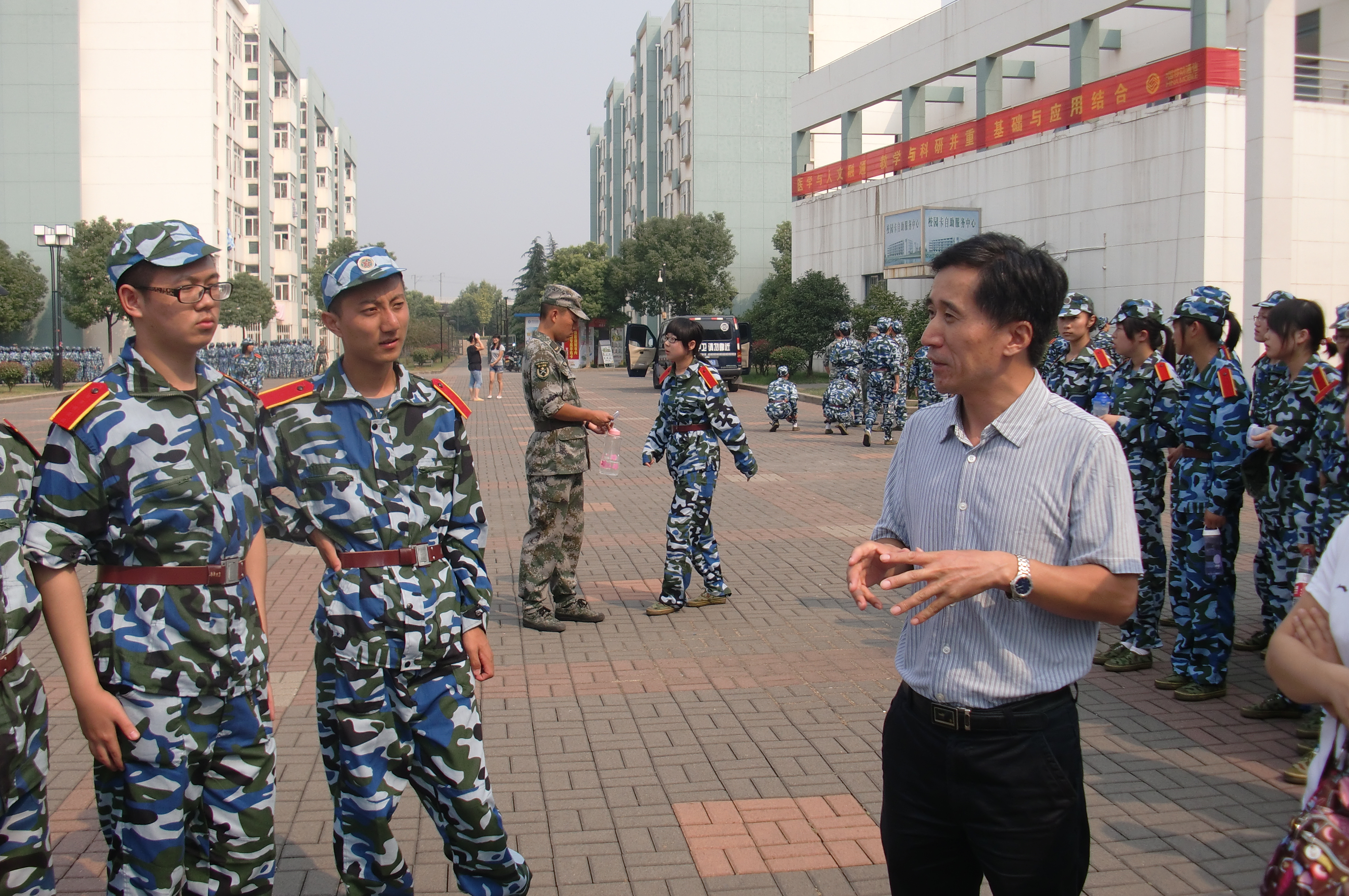 慰问中,老师们亲切的与学生们话着家常,同时嘱咐大家注意天气变化,注意身体,发扬坚持不懈的精神,在军训过程中锻炼自己。苏荣健副书记在临走时还特意叮嘱大家:要努力学习,同时学会照顾自己,同学之间要互相帮助。
