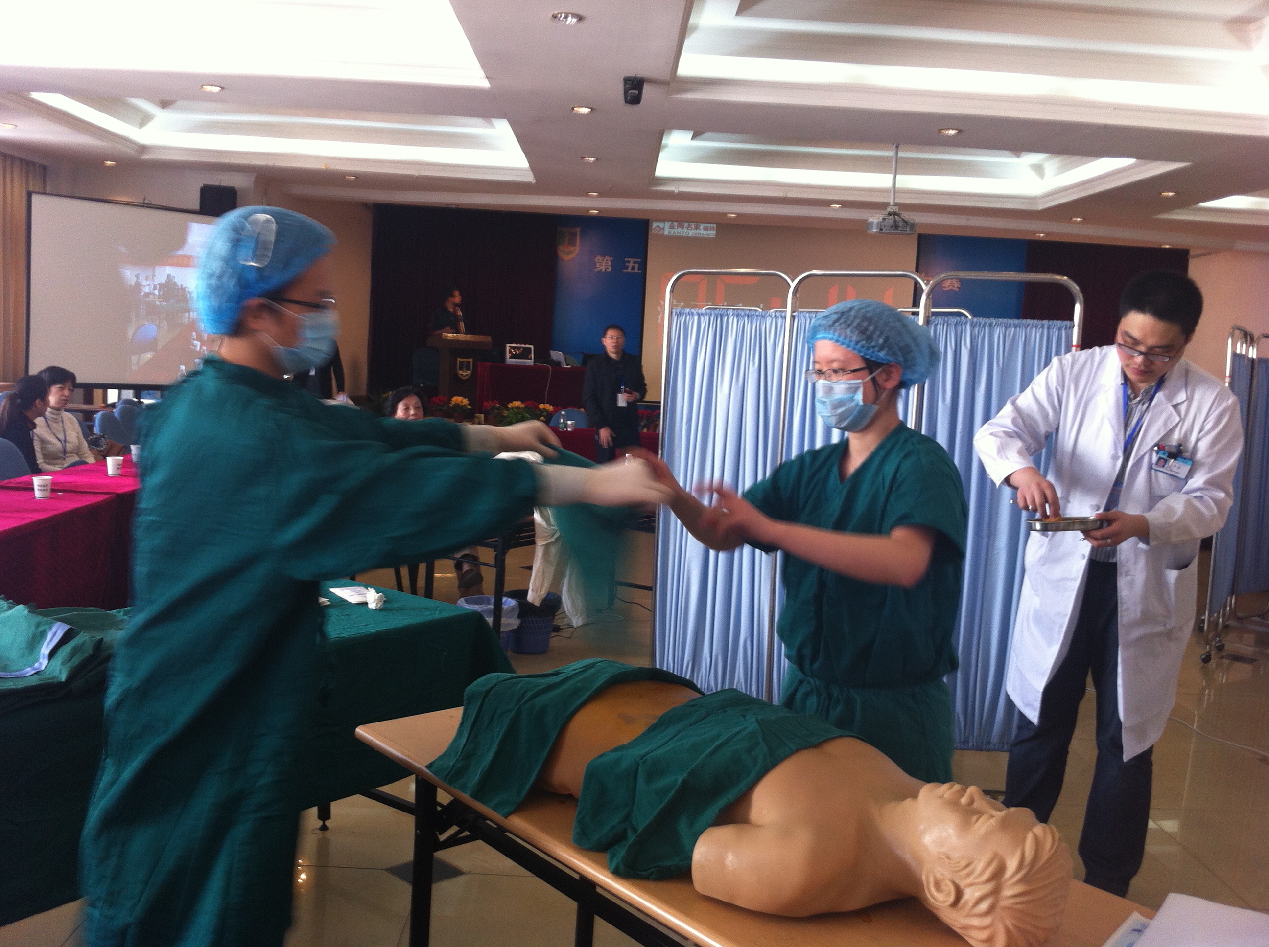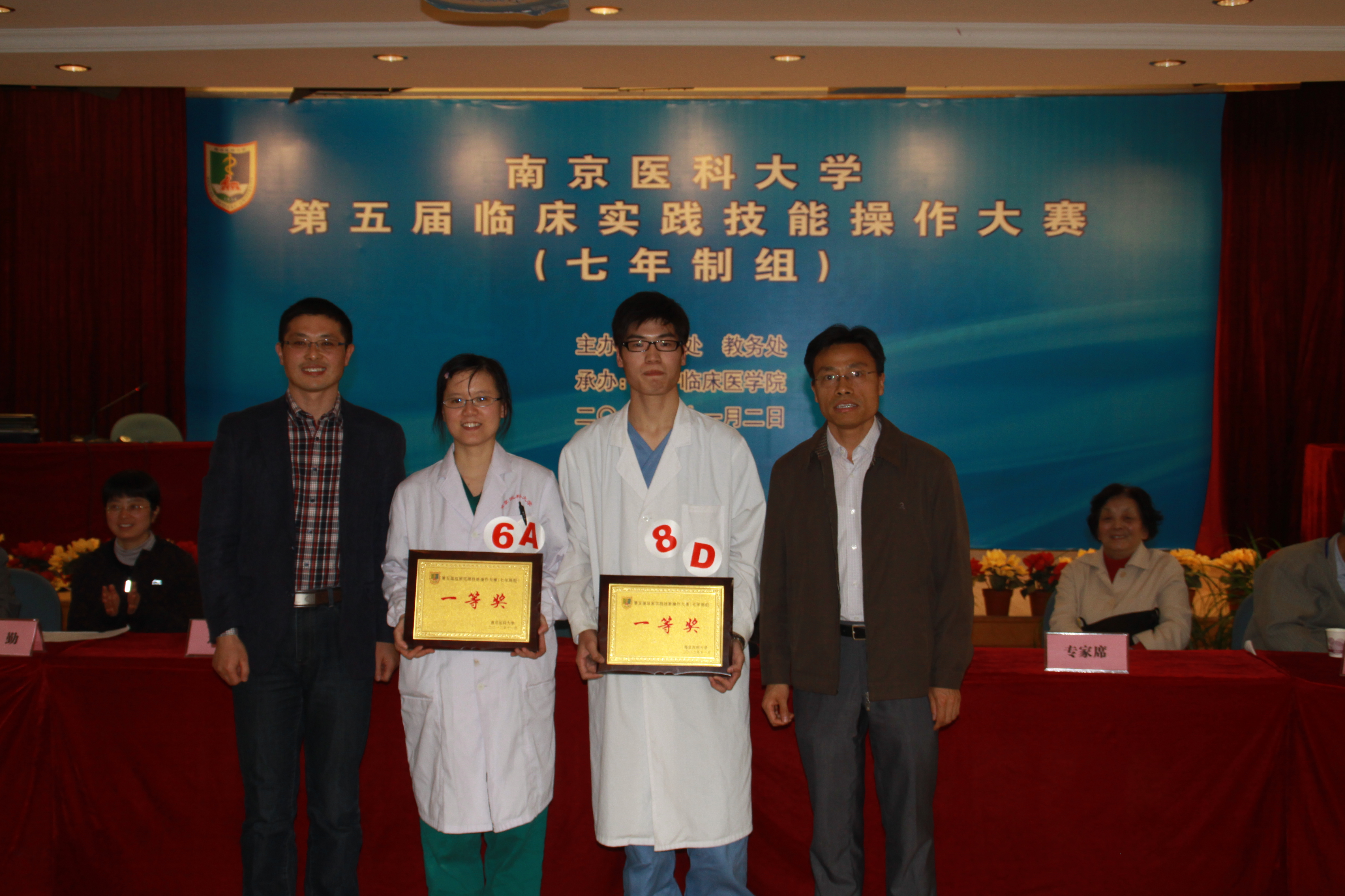 2012年11月2日,第五届校临床技能操作大赛(七年制组)在我校五台校区图书馆正式举行。此次大赛,汇集了来自南京无锡上海杭州不同实习点的学生代表,在校领导及来自各家附属医院的带教老师们共同见证下,展现临床技能,展现实习成果,展现了新一届七年制实习生的风采。通过多站式操作考核、知识抢答等环节,经过激烈而有条不紊的初赛及复赛,南京医科大学第一附属医院代表队辅容、张龙、尹莉、商静萍最终荣获一等奖,其中辅容、张龙获得腹腔穿刺术单项奖,商静萍获四步触诊单项奖。借着专家老师们的中肯点评,我们看到了08级七年制学生的实力,看到了他们广阔的未来。在此,特别感谢所有校领导为我们提供这样珍贵的交流机会,感谢附属医院的带教老师们孜孜不倦的教诲,感谢所有为这次比赛尽心尽力的师生!谢谢!