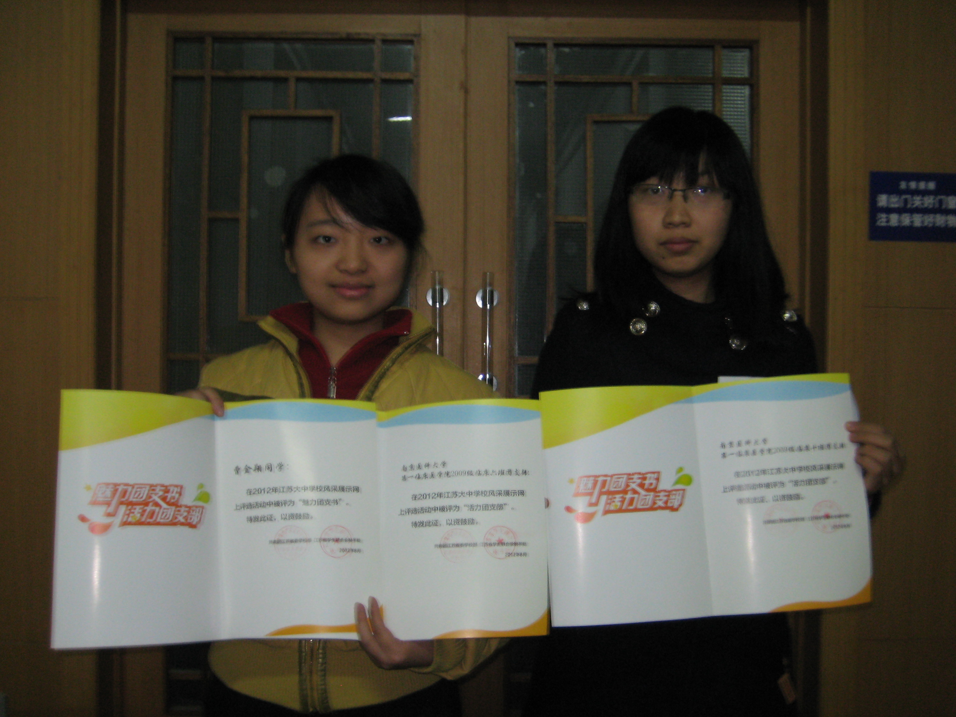 2012年11月3日,共青团江苏省委在常州举行了2012年全省大中专学校“魅力团支书,活力团支部”风采展示活动总结表彰大会。作为全校唯一的获奖单位,第一临床医学院2009级临床6班和临床10班两个团支部被评为“活力团支部”,第一临床医学院2009级临床6班的曹金翔同学被评为“魅力团支书”。