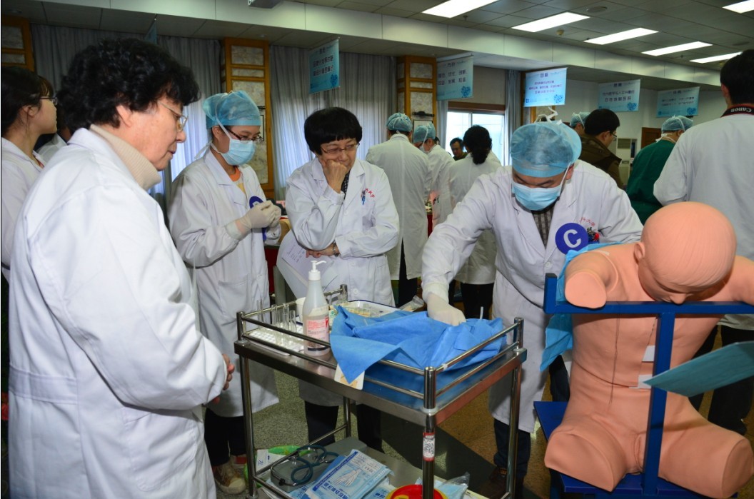 在为期一天紧张有序的检查过程中,专家组通过理论听课、模拟诊疗、内外妇儿技能操作、视频纠错、医学知识抢答、病历书写抽查及拓展项目等一系列检查,对我院近半年的临床教学工作进行了全面、细致地考核。感染科章莉莉主任讲课内容条理清楚,重点突出,与临床相结合,师生之间的互动很好,生动的讲课给同学们留下深刻的印象。在模拟诊疗考核中,儿科陈辉主任带领崔畅同学,一上场就针对SP病人出现的紧急情况进行应急处理后再开始问诊诊疗,这一点得到了专家组的一致好评;视频纠错和知识抢答环节,大家你来我往互不相让,比分相互追赶,最终妇儿组以140的高分取得了胜利。与此同时在影像4楼实训中心进行着另一场紧张的国教院南亚班实习生全英文教学检查,妇产科郭萌老师带教毕同欢同学做了历时1个半小时全面系统的模拟诊疗,紧接着国教院专家考核了轮转过外科的两名印度学生的切开缝合打结,她俩的操作得到了专家的好评,专家评价是检查的几家医院中表现最好的。下午1:00准时进行临床技能操作考核,由专家随机抽取18名学生进行考核,七年制组考核的项目是:胸腔穿刺术、阑尾手术的术前准备及妇科检查,五年制组考核的项目是:腹腔穿刺术、切开缝合打结及产科检查。