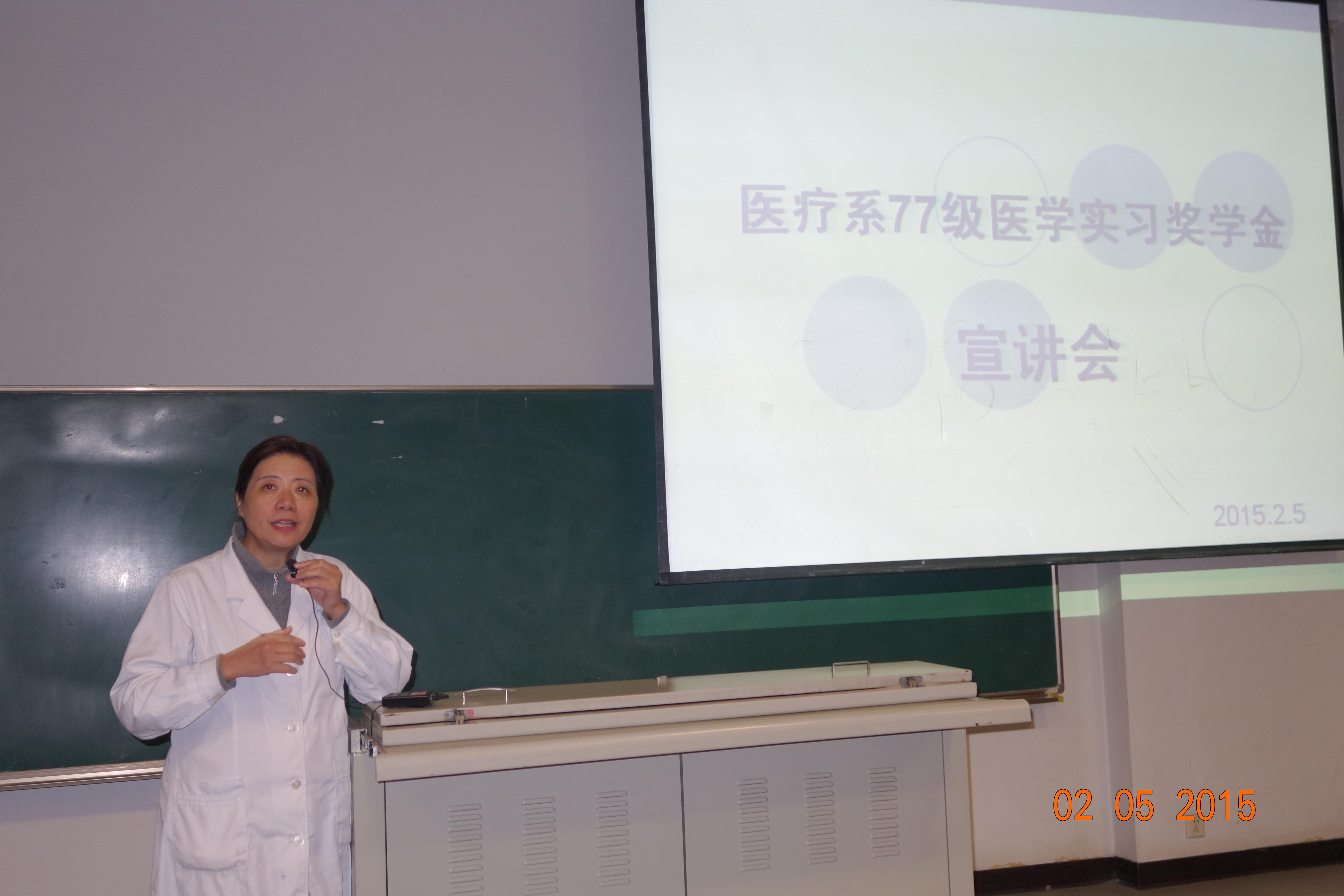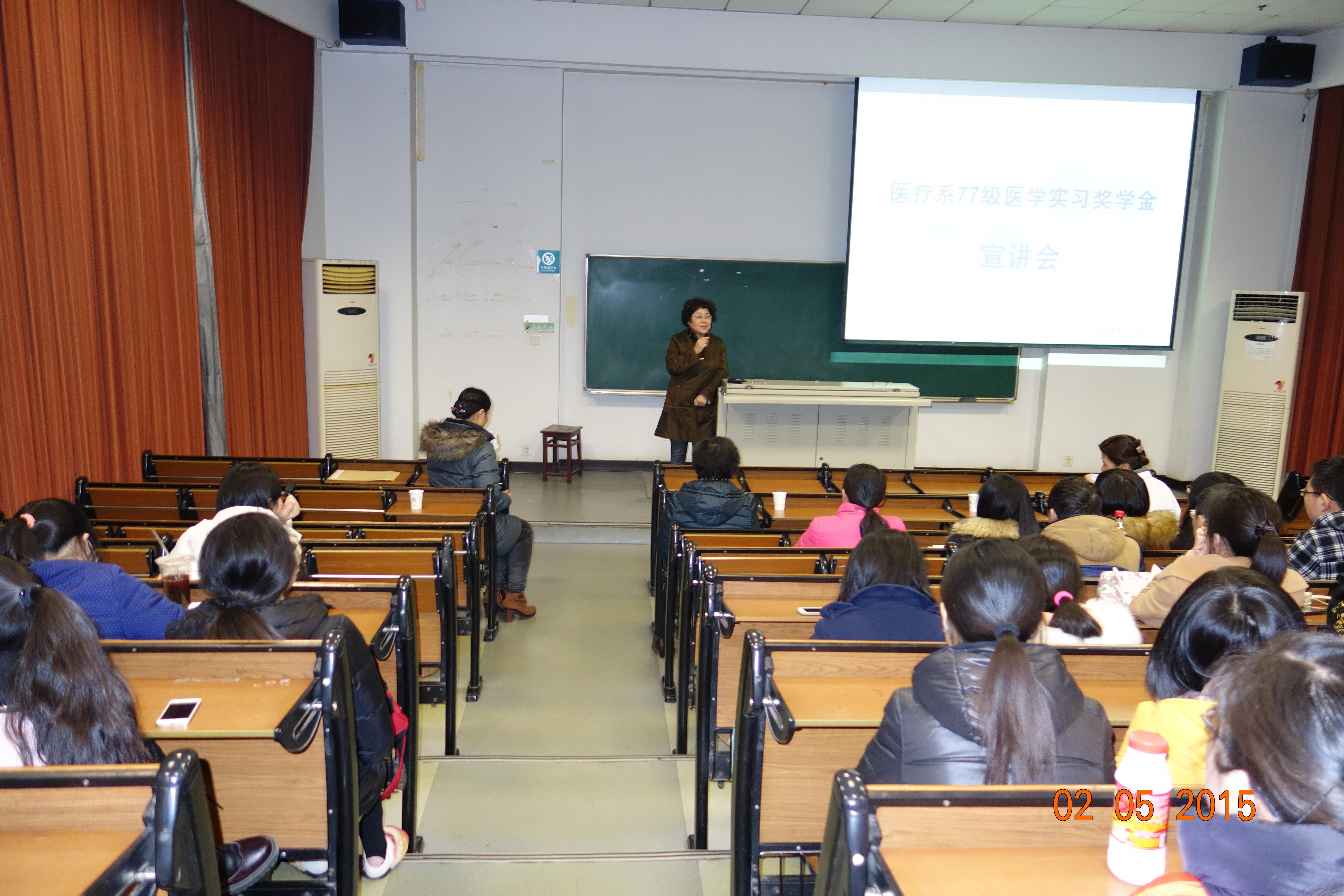 2015年1月25日晚,医疗系77级“医学实习奖学金”宣讲会在五台校区先知楼101教室举行。我校生殖医学教授刘嘉茵、神经内科学教授陈伟贤百忙中亲临会场宣讲。第一临床医学院常务副书记陈亚新、副书记邹伶俐、学工办钟珊主任和王建伟老师,以及来自一附院、市一院、鼓楼医院、八一医院实习点的70多名学生参加会议。邹伶俐副书记主持会议。