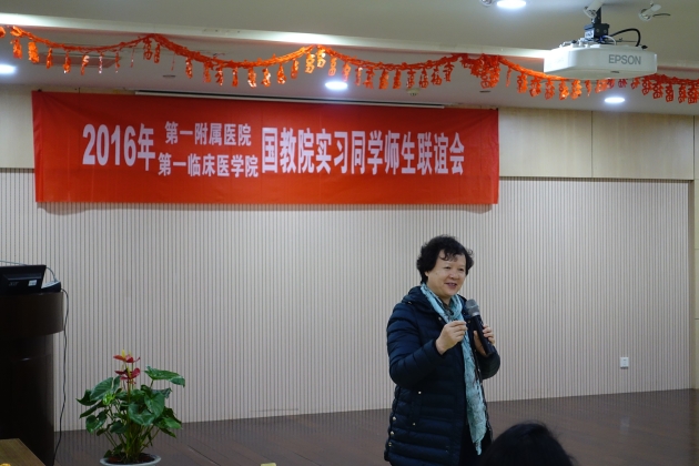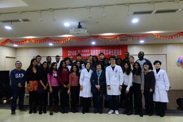 12月23日,在圣诞节来临之际,由第一临床医学院组织的“2016年国教院实习同学师生联谊会”在老年医学A楼学术报告厅举行。参加此次联欢活动的包括全体在一附院实习的国教院同学、第一临床医学院陈亚新书记、殷咏梅院长,国教院钟轶主任,带教老师代表及12七年制优秀中国学生代表,大家欢聚一堂,共同欢庆即将到来的圣诞和元旦。联欢会由教务办李萍主任主持。