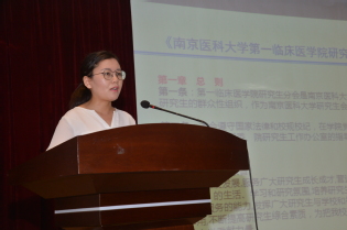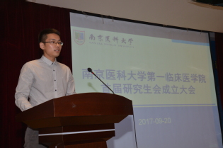 首先,由一临研会主席李畅同学向大家介绍首届研究生会成立的筹备过程。根据共青团南京医科大学委员会和研究生工作部共同下发了《关于成立各研究生培养单位研究生分会的通知》,我院从今年5月起正式启动研会筹备工作,经过公开招聘、自荐、推荐、考核、公示等环节,并报学院党委批准同意,正式组建第一临床医学院研究生会,并作为校研究生会分会成员。首届研究生会设主席团、秘书处、学术部、文体部、外联部和实践部,由来自各年级硕士、博士代表41人组成,拥有会员1600多人。