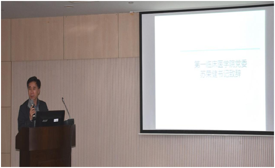 最后,第一临床医学院党委常务副书记苏荣健老师发表讲话。在对第一届研究生会的工作给予充分肯定,对新当选的第二届研究生会委员表示祝贺后,他对新一届研会委员会提出六点希望。他希望各位委员能够注重组织建设的完善优化,提高工作效率;能够加强对工作能力、经验的学习,更好地构建师生间的桥梁;能够积极主动开展学生活动,促进博士与硕士、科硕与专硕、研会与班级间的交流;能够不断完善规章制度及工作流程,切实地为同学服务;能够与校研会、其他学院分研会建立广泛的交流与合作,增加一临研会的荣誉度;能够以身作则,在工作、学习、研究及生活中做好榜样作用,团结和带领一临同学共同进步。