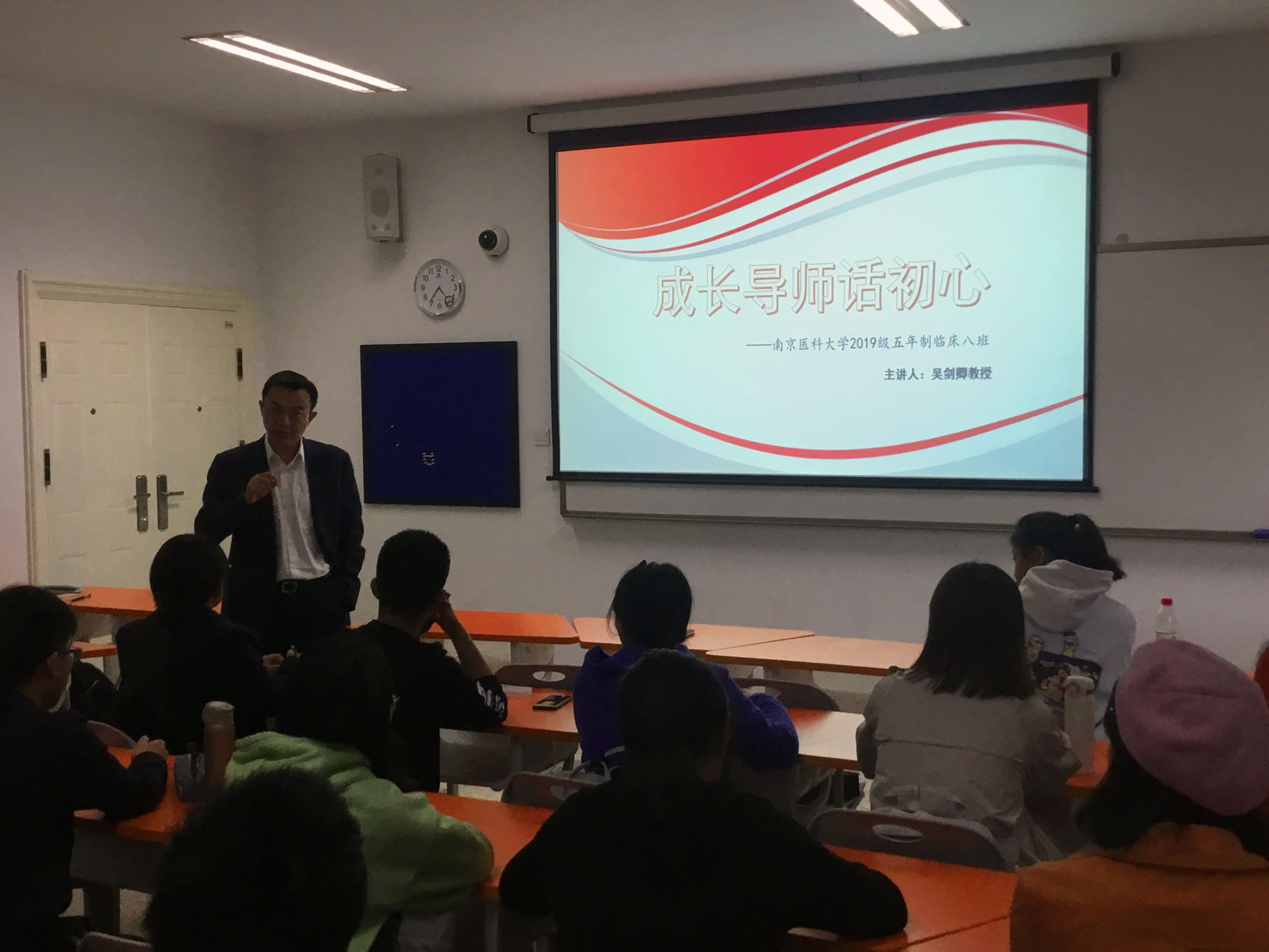 10月29日下午,19级临床医学五年制8班全体同学在康达楼k114教室举行了成长导师初心对话活动。南京医科大学第一附属医院老年医学科主任、老年医学教研室副主任、老年呼吸科主任吴剑卿教授作为成长导师受邀出席,与同学们亲切交流,畅聊初心。