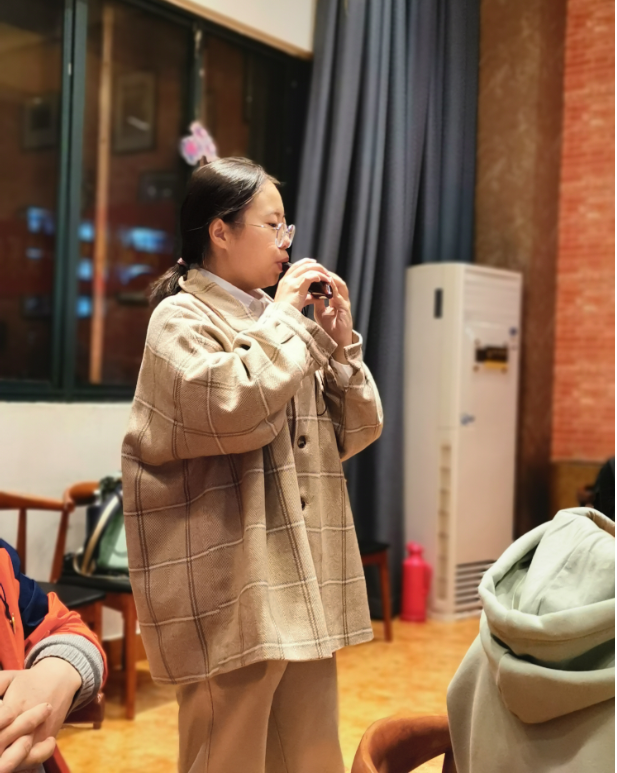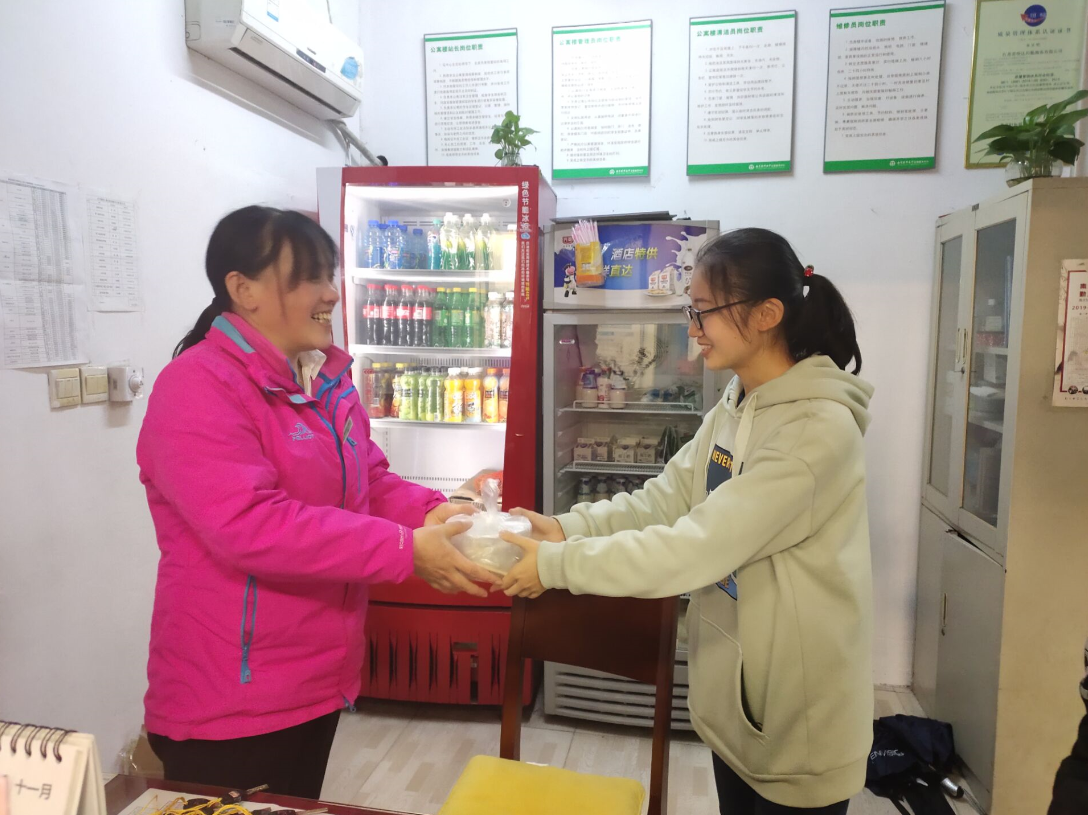 在活动接近尾声的时候,成真同学为大家表演了陶笛独奏,悠扬的旋律为整个活动又增添了一丝乐趣。在成真同学的带动下,全班同学先后合唱了《我和我的祖国》、《感恩的心》这两首歌,以此感恩我们的祖国、父母和老师。在学校生活中,宿管阿姨就是同学们的“家长”,班长于姜和团支书刘敏代表天元班全体同学将打包好的饺子送给还在寒冬中值班的宿管阿姨,以表达同学们对宿管阿姨的感恩之情。