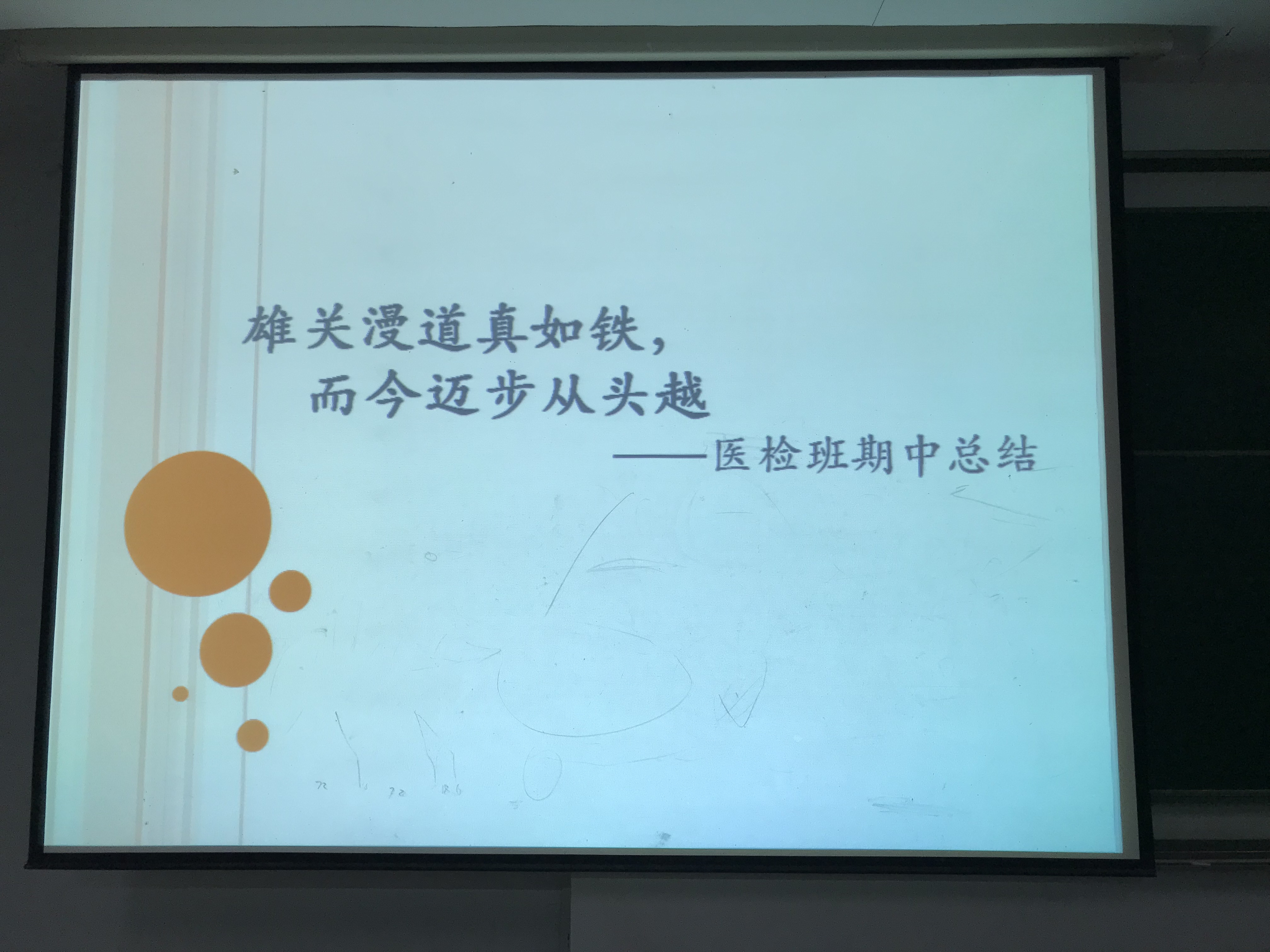 12月15日,医学检验班全体同学在明达楼k117开展了“雄关漫道真如铁,而今迈步从头越”期中总结主题班会,班长朱叙主持本次活动,特别邀请了兼职班主任孙黎老师。