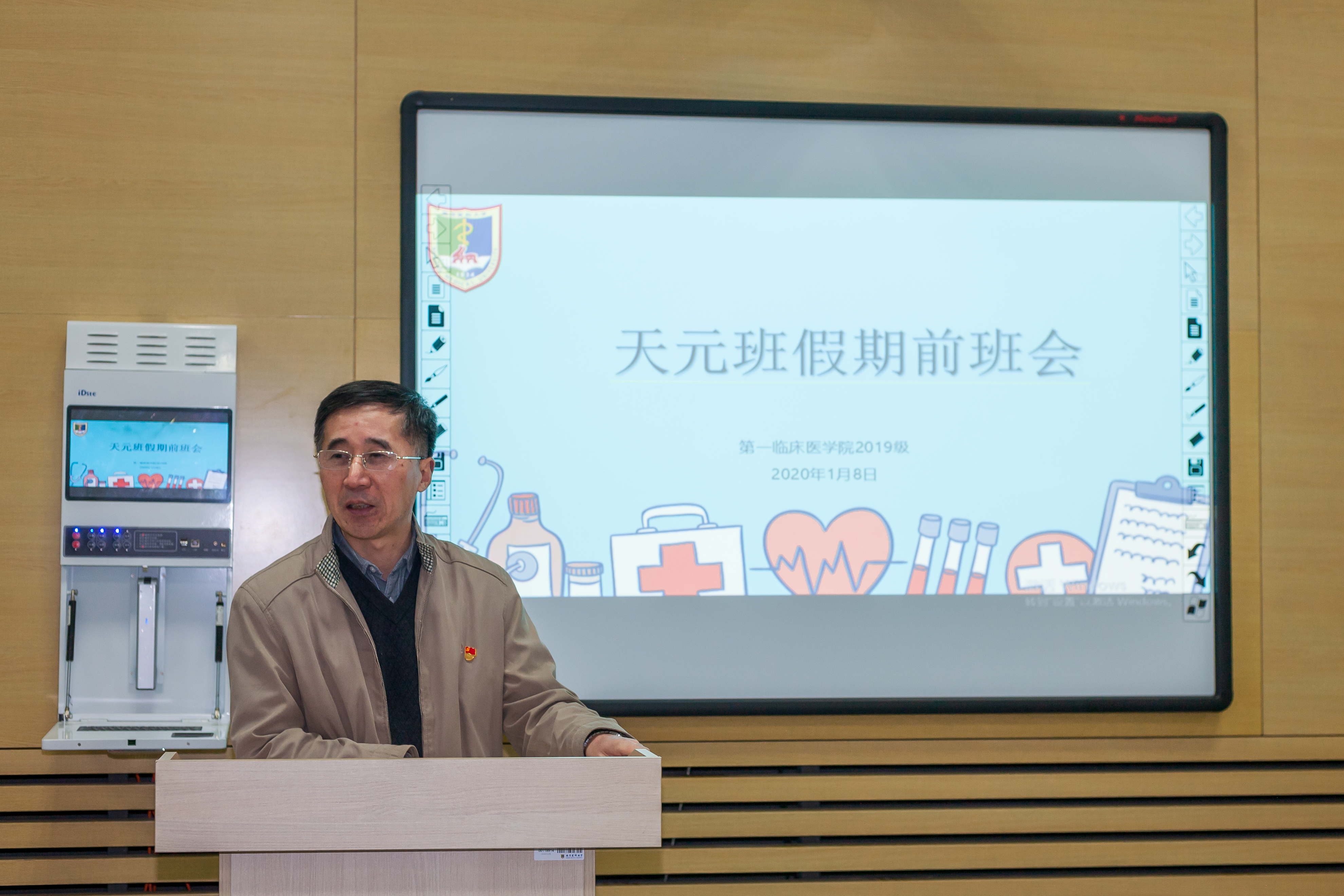1月8日下午,2019级本硕博一贯制临床天元创新班寒假前班会在学海楼c141召开,参加本次班会的有学院党委常务副书记苏荣健老师、副书记副院长盛彤彤老师和天元班全体同学,会议由辅导员老师主持。