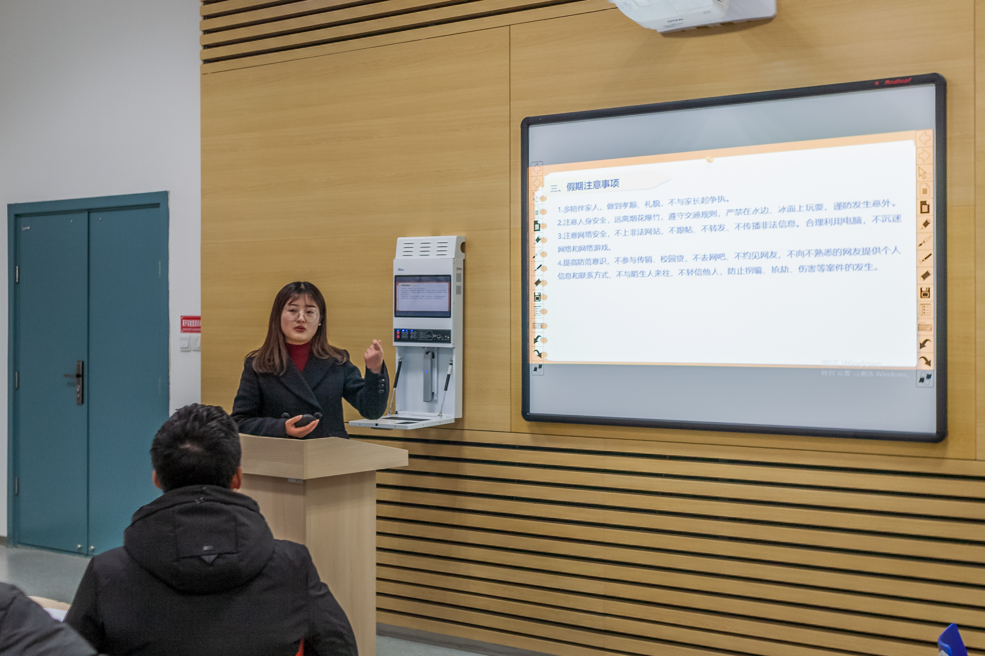 会上,张老师强调了离校前注意事项,叮嘱同学们在假期中注意人身安全、财产安全,防骗、防盗、防意外伤害;提醒同学们安全有序准时返校,为新学期做好准备。同时也希望同学们认真完成寒假作业,利用好寒假的时间对自己上一学期的学习、生活、参加活动等情况做一个总结,在下学期查漏补缺,争取全面发展。