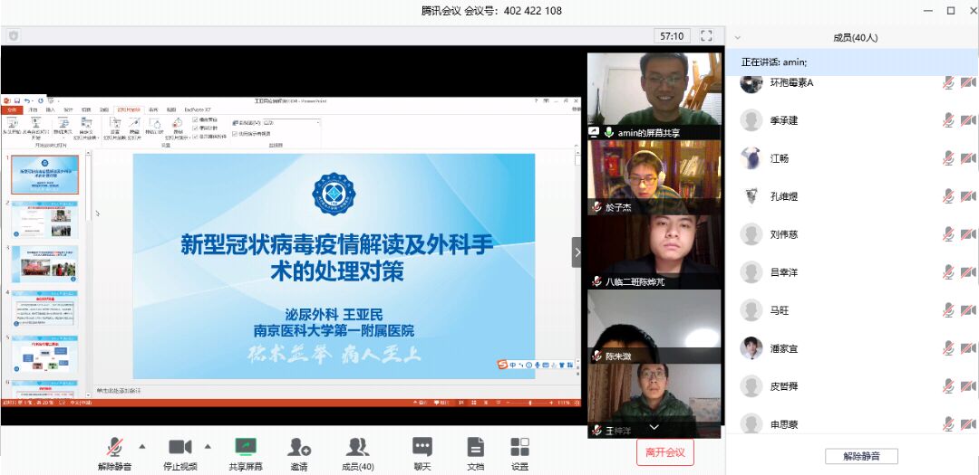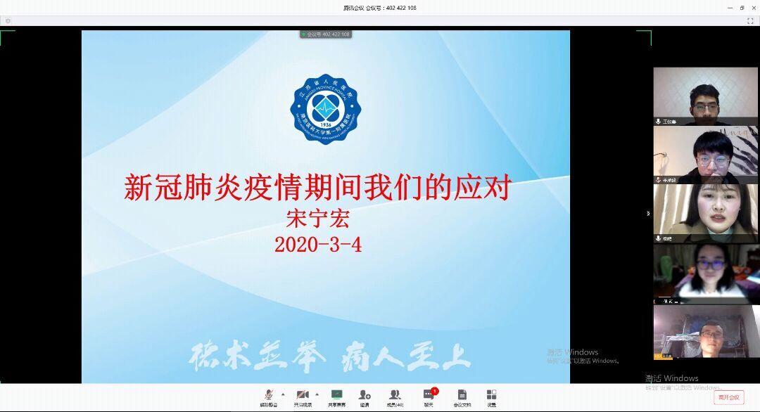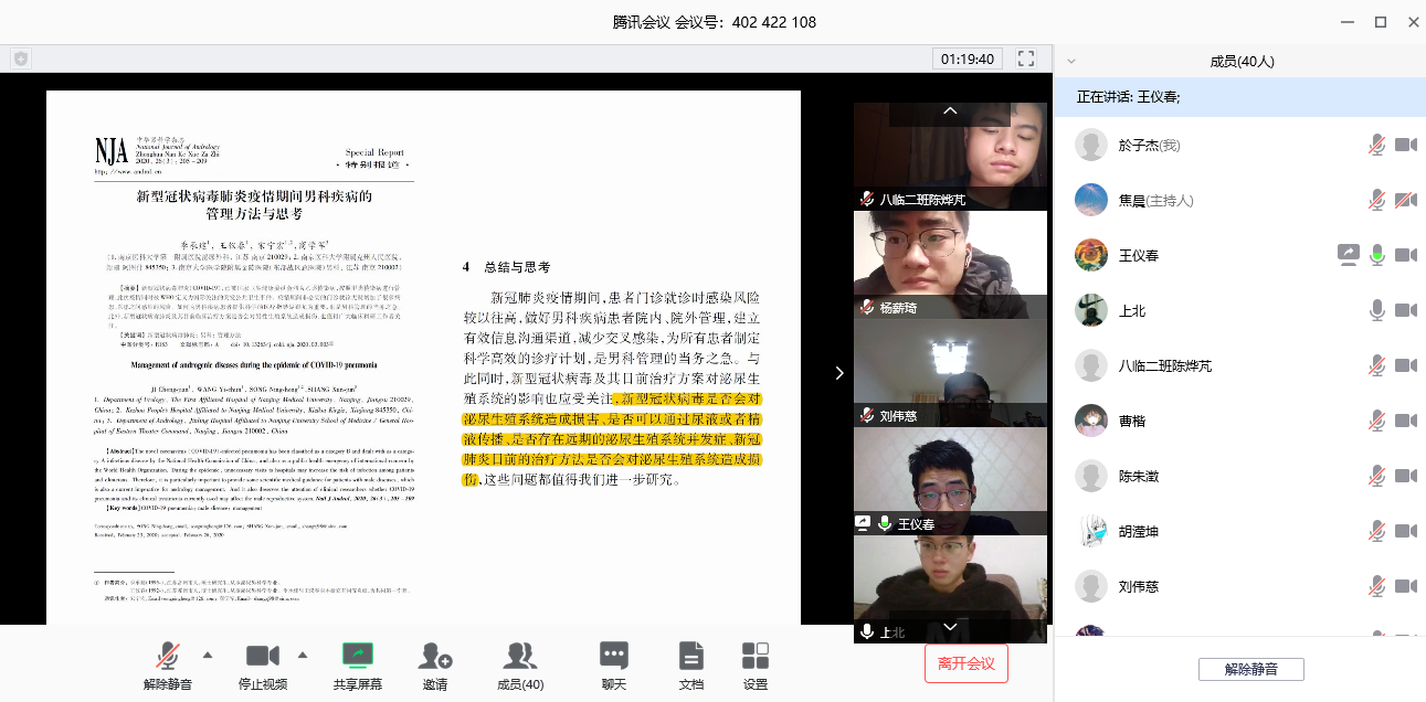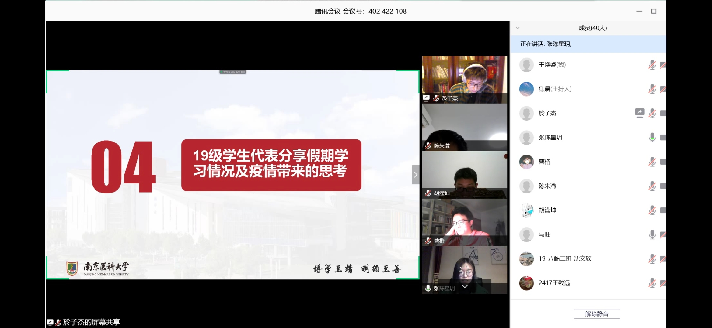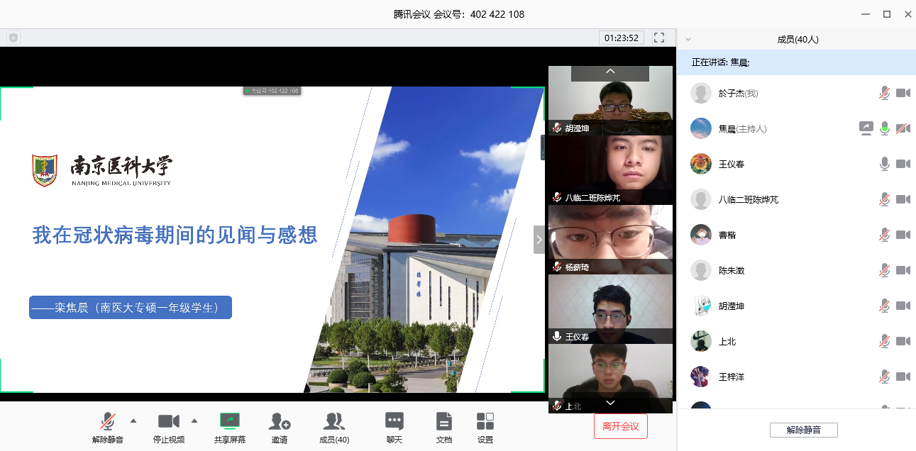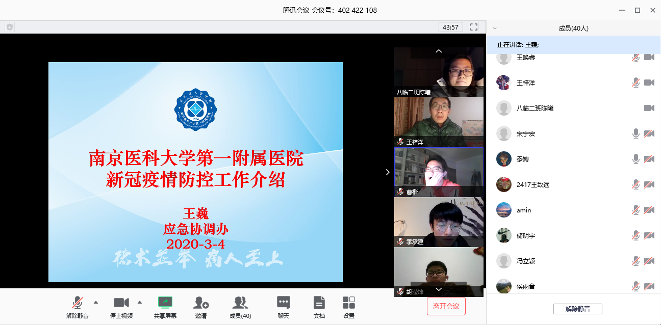 王巍和王亚民两位老师分别对现阶段疫情的解读、一附院疫情防控工作和疫情期间外科手术的管理等方面给同学们做了详细的分享。王仪春等几位研究生为同学们讲述了他们坚守一线工作时的生活和感触。他们的分享向同学们传授了在工作期间如何发现问题并将临床实践和科研结合到一起的成功经验。