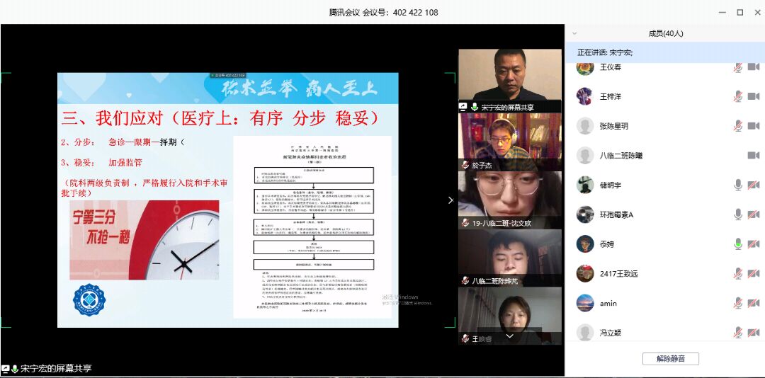 宋教授就目前疫情阶段医院概况及支援湖北情况进行了详细的介绍。目前,我国的疫情已经出现向好的势头,但也是工作最关键的时期,他强调有党中央的坚强领导、有中国特色社会主义制度优势,有广大医护人员勇往直前,有全体人民万众一心,我们一定能打赢这场疫情防控阻击战。