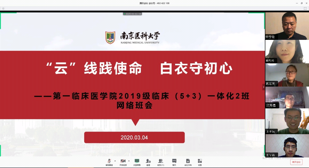 3月4日晚,第一临床医学院借助网络平台召开成长导师线上班会,成长导师一附院泌尿外科主任医师、医务处处长宋宁宏教授、第一临床医学院学工老师、研究生代表和19级临床医学(5+3)一体化2班全体同学参加了班会。
