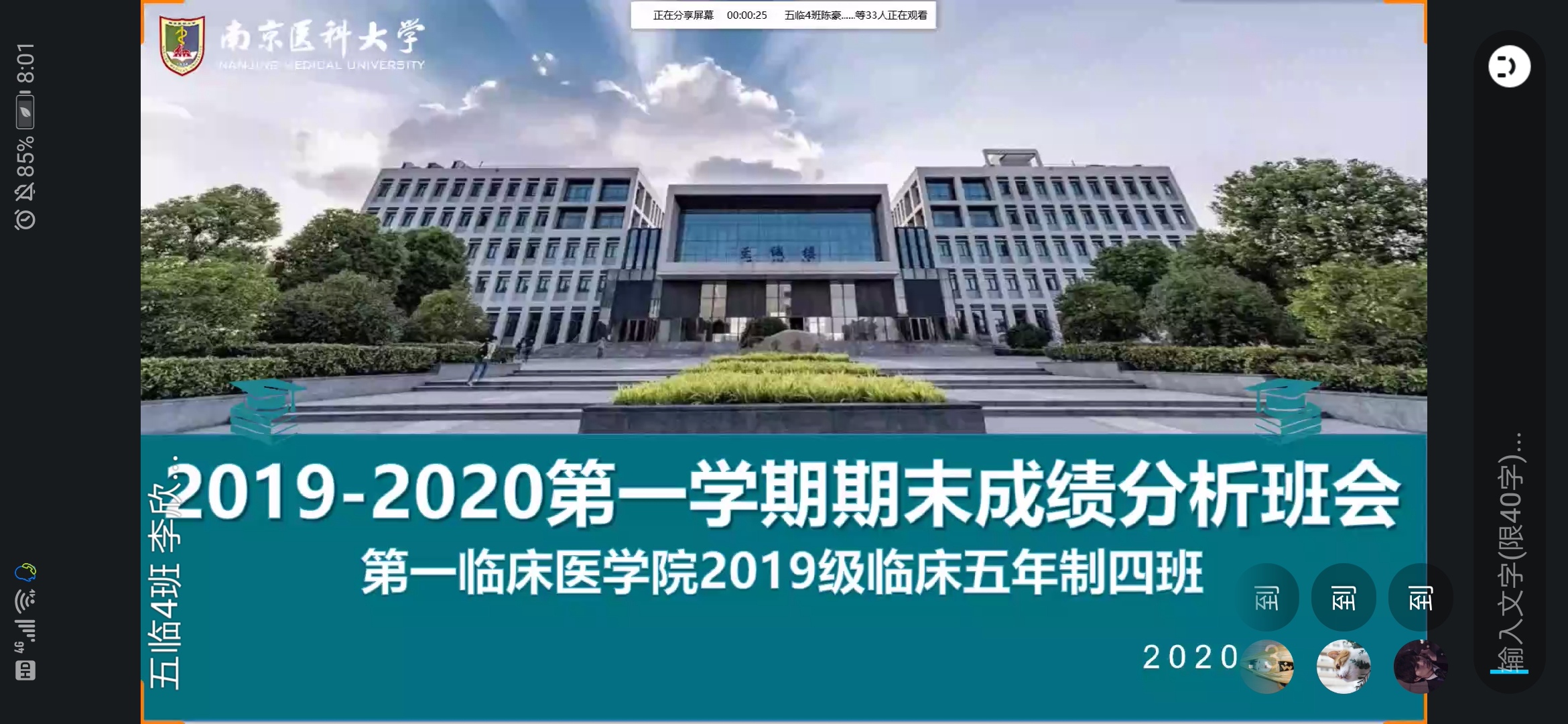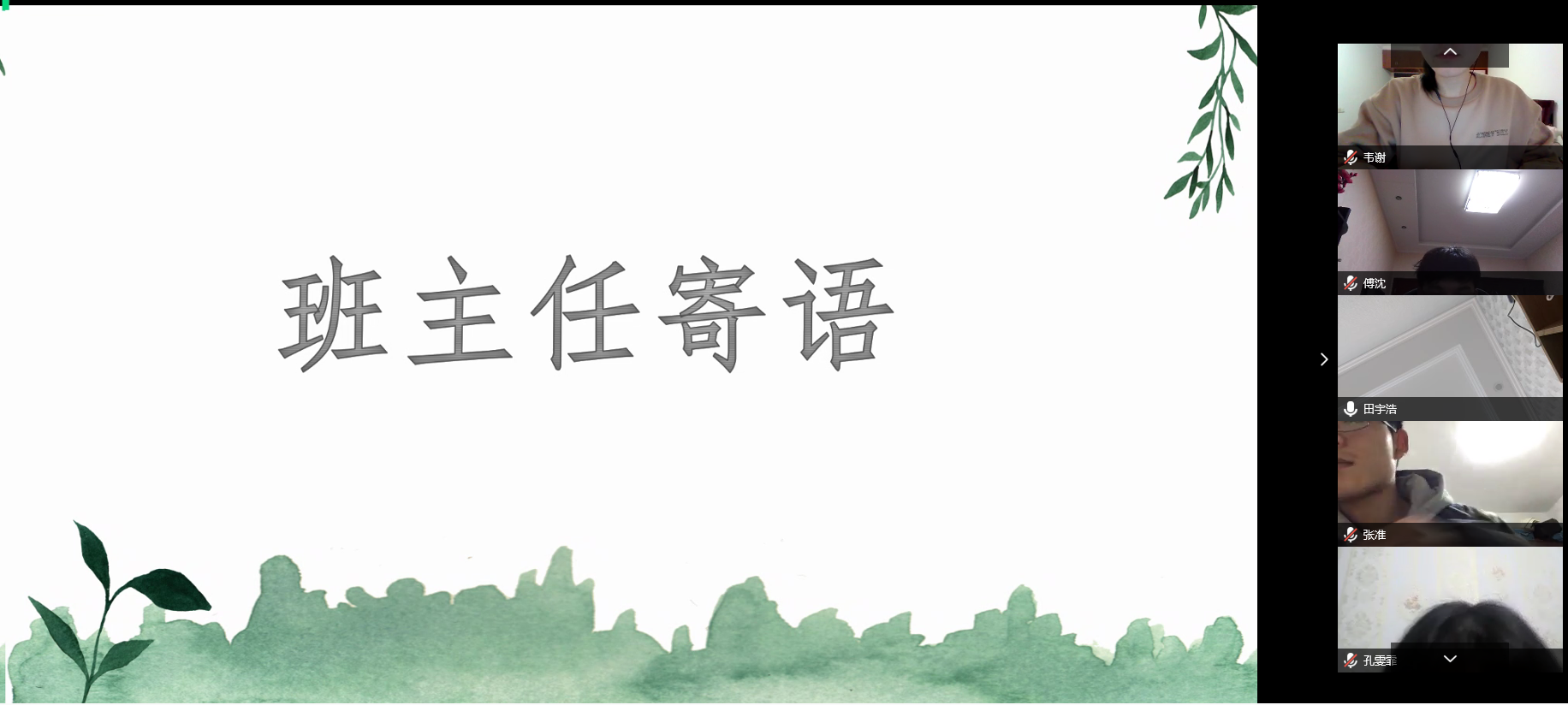 接着,兼职班主任向同学们分享在疫情期间一附院对于疫情的应对情况和新冠肺炎相关知识的解答,同时也分享了自己以前提高学习成绩的小窍门和从事科研与临床工作的经验,告诉同学们要像冲在一线的科研人员和医务工作者们学习,现阶段在家期间在做好防护的同时,也要认真学习,用心生活,调试好心态,等待返回校园。