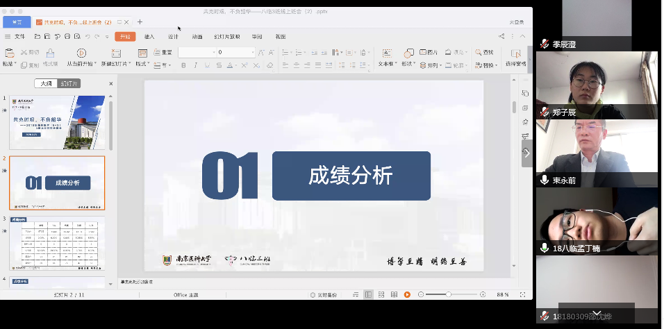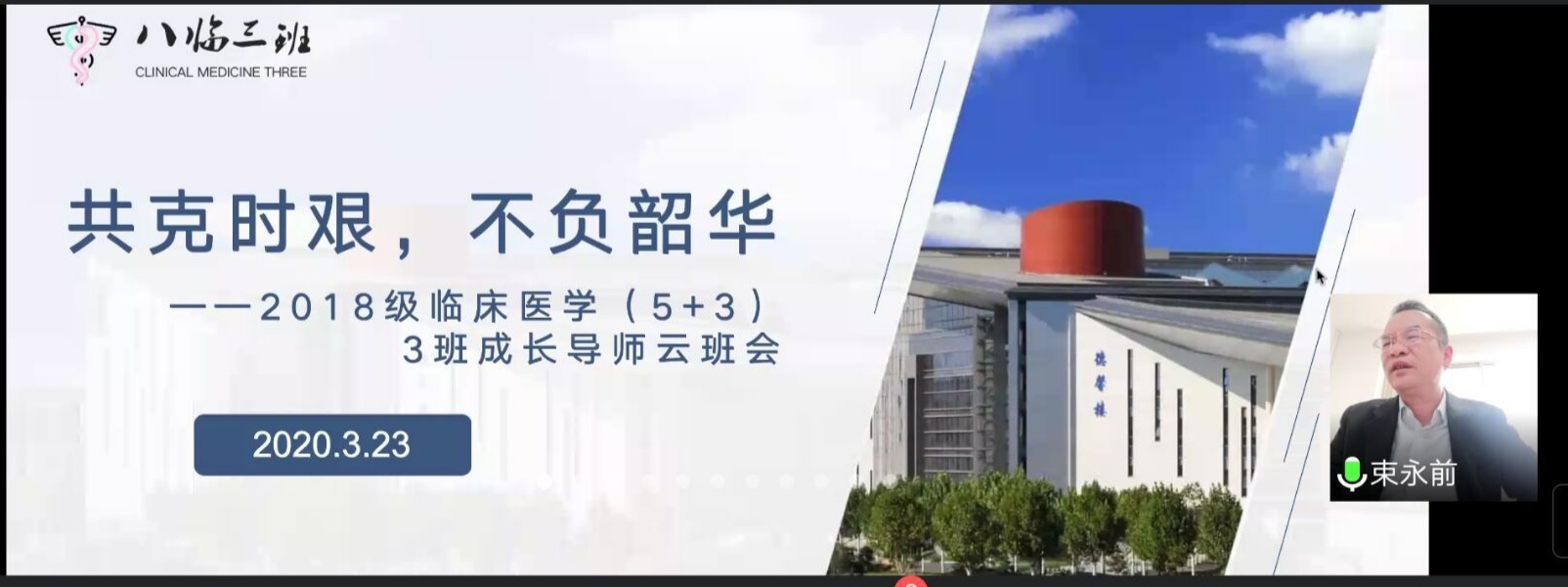 2020年3月23日,第一临床医学院2018级临床医学(5+3一体化)3班开展了“共克时艰,不负韶华”成长导师主题云班会。成长导师第一附属医院肿瘤科主任束永前教授、辅导员熊潇、陈琪波老师及班级全体同学参加了班会。班会由班长郝润润主持。