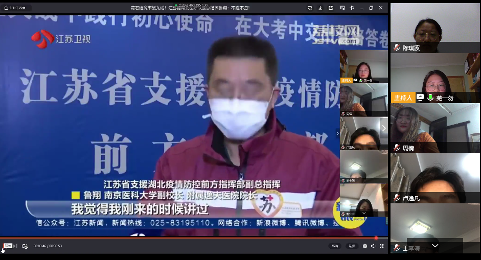 班会上,学习委员李佳淇进行了班级成绩分析,从各科目分数段分布、平均分、及格率等方面对班级大二上学期学习情况进行了回顾总结;施响、王媛媛同学交流了线上学习的心得体会,分享高效学习的方法;同学们共同观看了江苏医务人员驰援湖北的抗疫视频以及本班同学录制的抗疫诗会,交流了居家学习的生活状态;吴琛老师结合自己的工作分享了近两个月医护人员的抗疫过程,并回忆了自己大二的学习时光和作为年轻外科医生的体会,让同学们受益匪浅。
