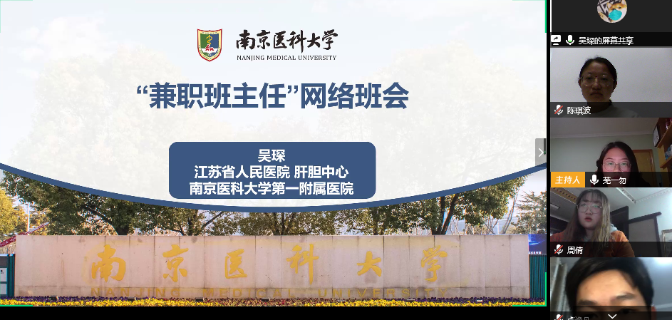 2020年3月25日,第一临床医学院2018级临床医学五年制1班开展“相隔千里,抗疫同心”线上主题班会。兼职班主任吴琛老师、辅导员陈琪波老师及班级全体同学参加了班会。班会由团支书潘佳琪主持。