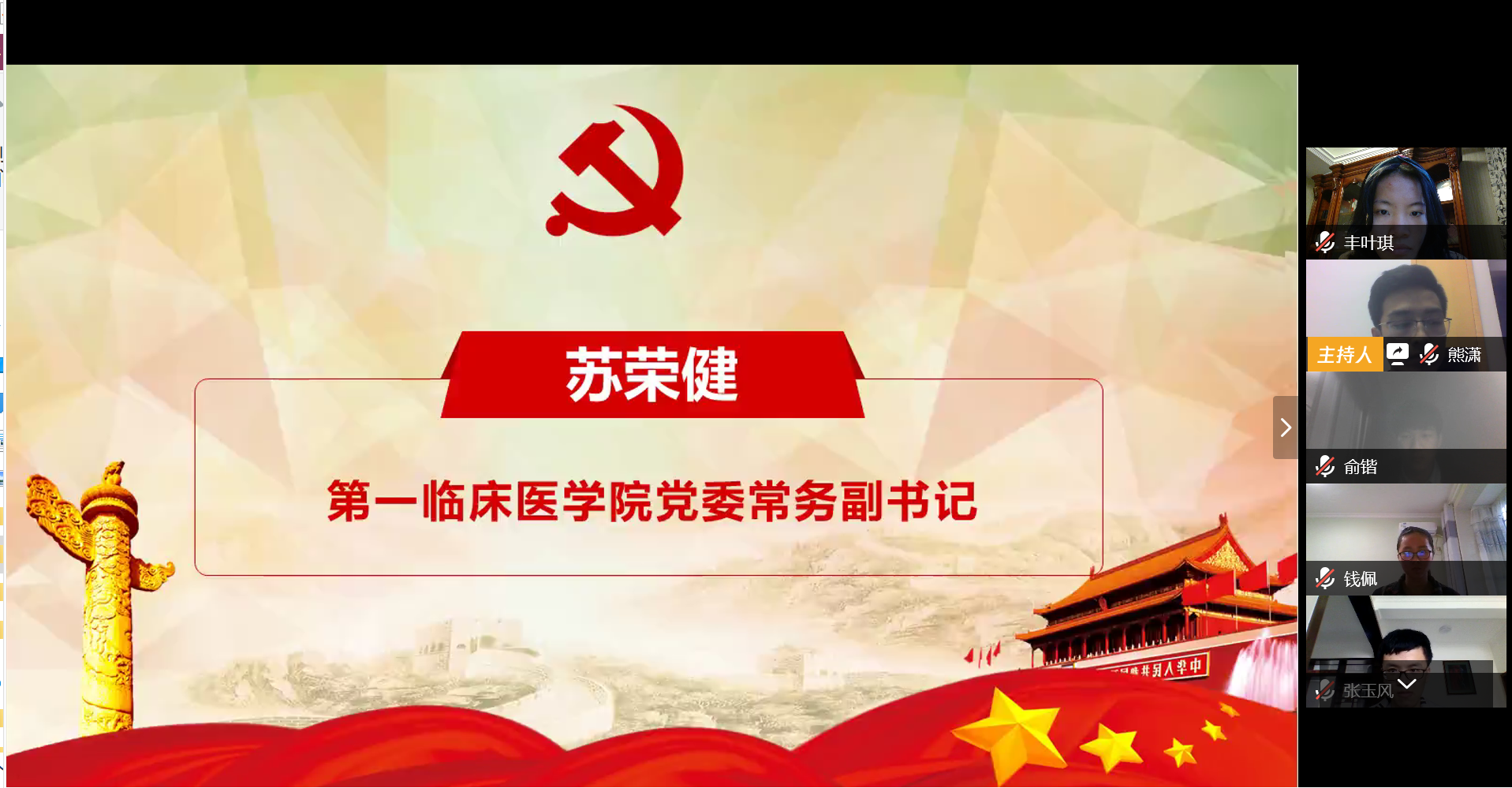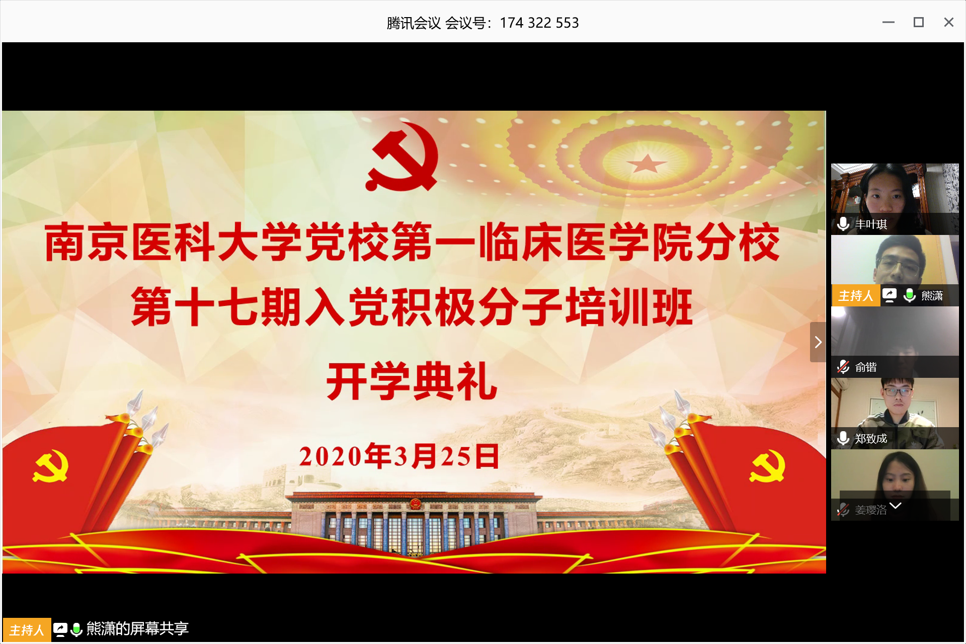 3月25日晚,南京医科大学党校第一临床医学院分校第十七期入党积极分子培训班举行线上开学典礼。校组织部常务副部长王兴东,第一临床医学院党委常务副书记苏荣健、第一临床医学院党委副书记、副院长盛彤彤,第二附属医院、第二临床医学院党委书记季国忠,第二临床医学院党委副书记、副院长黄辉,医学影像学院党总支副书记、副院长吴雅娜,组织员、辅导员老师以及230名积极分子或发展对象参加了此次开学典礼。典礼由盛彤彤主持。
