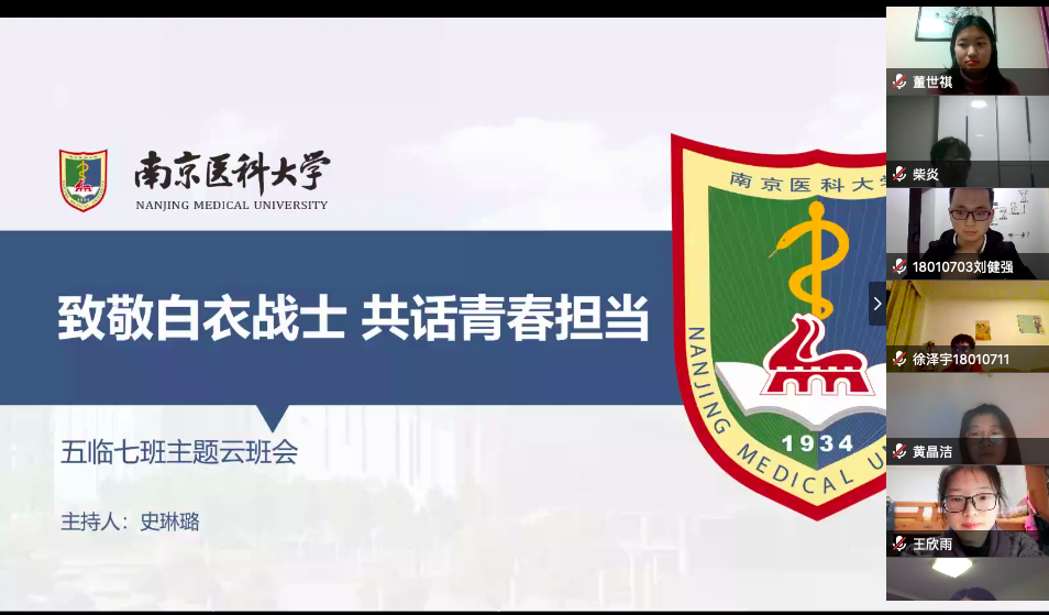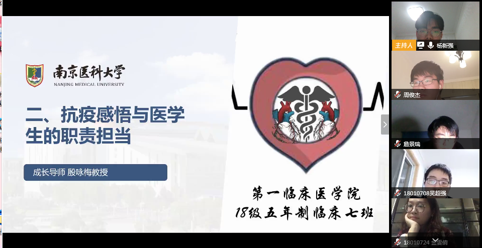 2020年3月27日,第一临床医学院2018级临床医学五年制7班开展了“致敬白衣战士共话青春担当”成长导师主题云班会。成长导师第一附属医院殷咏梅教授,辅导员熊潇、陈琪波老师及班级全体同学参加班会。班会由团支书史琳璐同学主持。