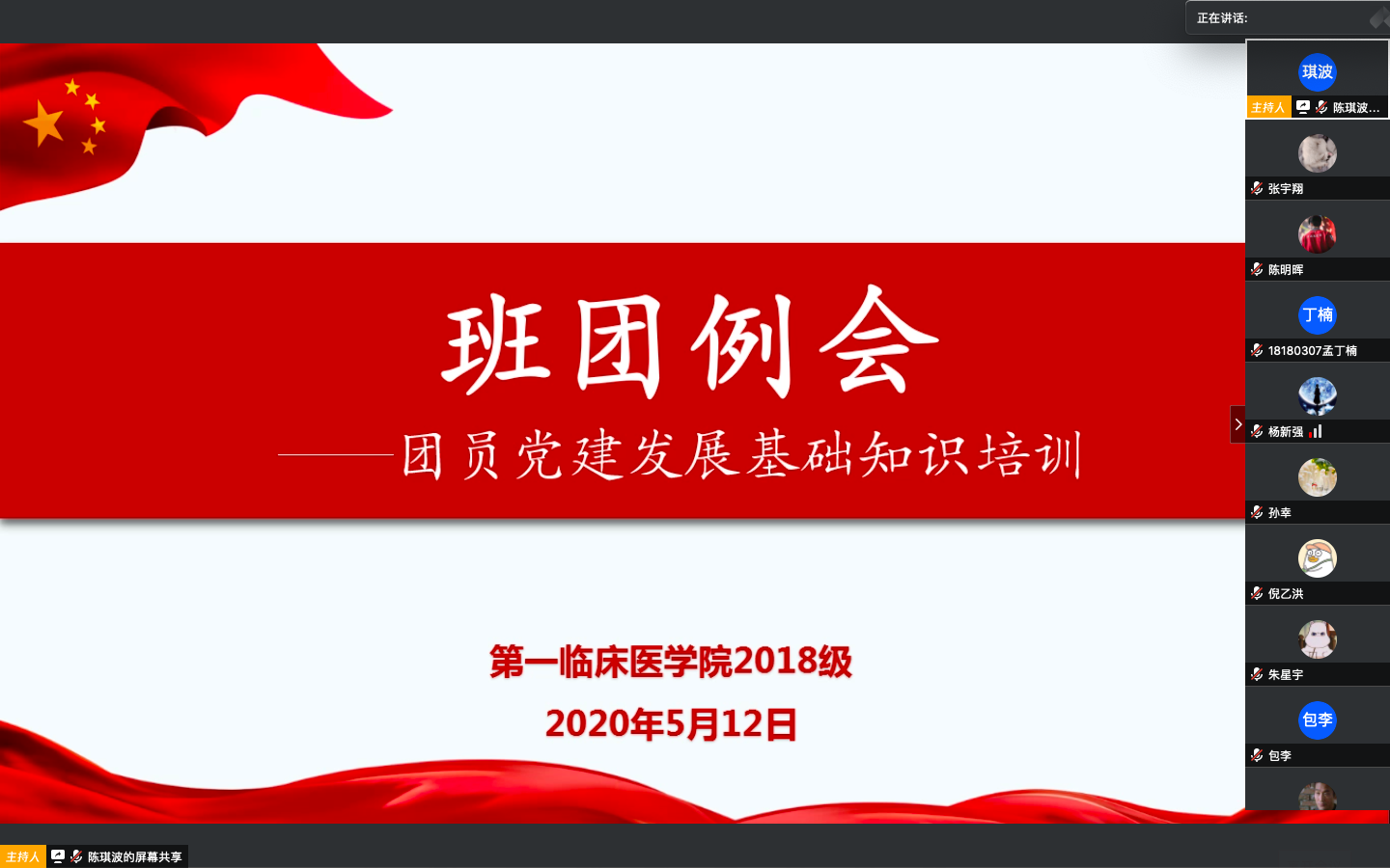 2020年5月12日,第一临床医学院2018级学工办组织召开班团例会。会议由辅导员熊潇、陈琪波老师主持,第一临床医学院分团委组织部成员、2018级各班班长和团支书参加会议。