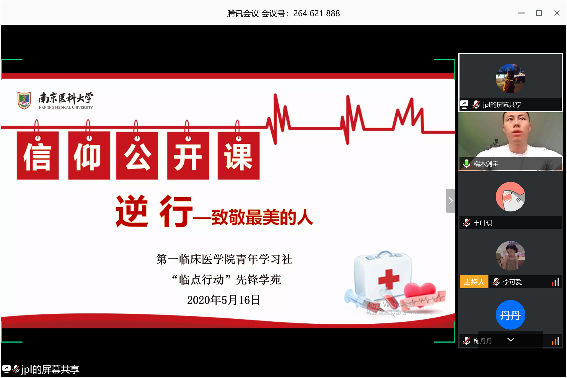 5月16日,第一临床医学院青年学习社暨“临点行动”先锋学苑举办了“绽放战疫青春 坚定制度自信”系列主题公开课第一讲,本讲主题为“逆行”。活动邀请了援鄂医疗队代表,第一附属医院心脏大血管外科护士端木剑宇老师担任主讲嘉宾,学院150余名同学参加。