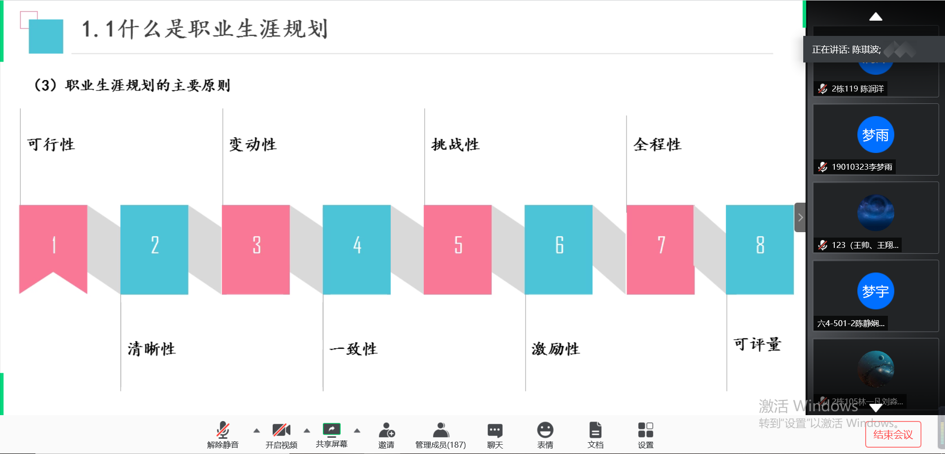 5月18日晚,第一临床医学院2019级开展线上《大学生职业生涯规划课》第一讲:职业生涯概论及相关理论。本次主讲老师为2018级辅导员陈琪波。2019级辅导员张婷婷、辅导员助理方文菁、钱静,以及2019级全体同学参与课程学习。此次课程的主要内容是带领同学们了解什么是职业生涯规划、为什么要做职业规划,以及一些经典的职业规划理论。