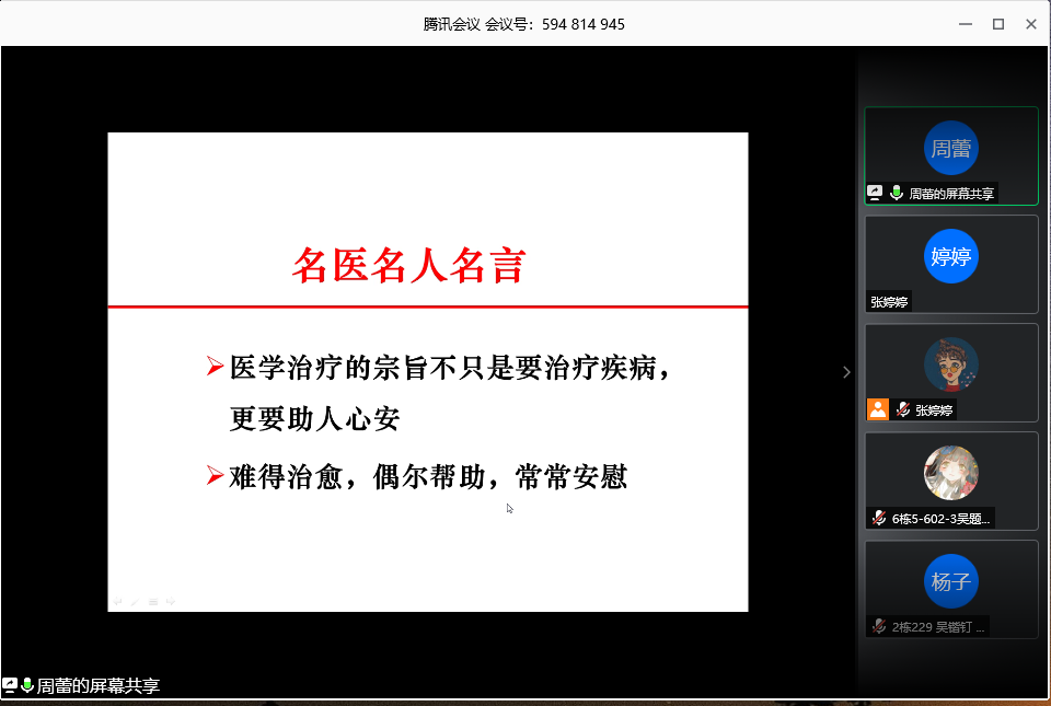 “医学治疗的宗旨不仅是治疗疾病,更要助人心安。难得治愈,偶尔帮助,常常安慰。”医生是个神圣的职业,希望通过此次课程,同学们能认真规划自己的学医生涯,充满人文关怀,在将来为医学事业贡献自己的力量。