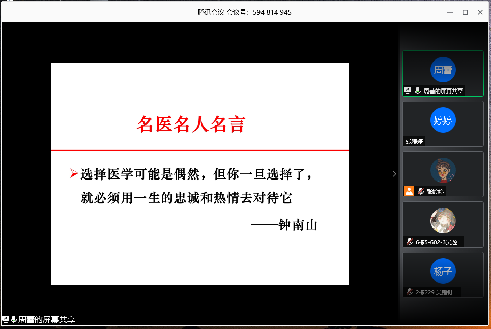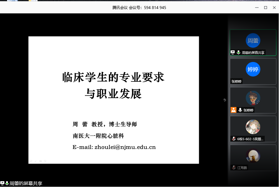 5月26日晚,第一临床医学院2019级开展线上《大学生职业生涯规划》第四讲:专业学业要求与职业发展。本次主讲老师是南医大一附院心脏科主任医师、博士生导师周蕾教授。辅导员、辅导员助理以及2019级全体同学参与本次课程学习。