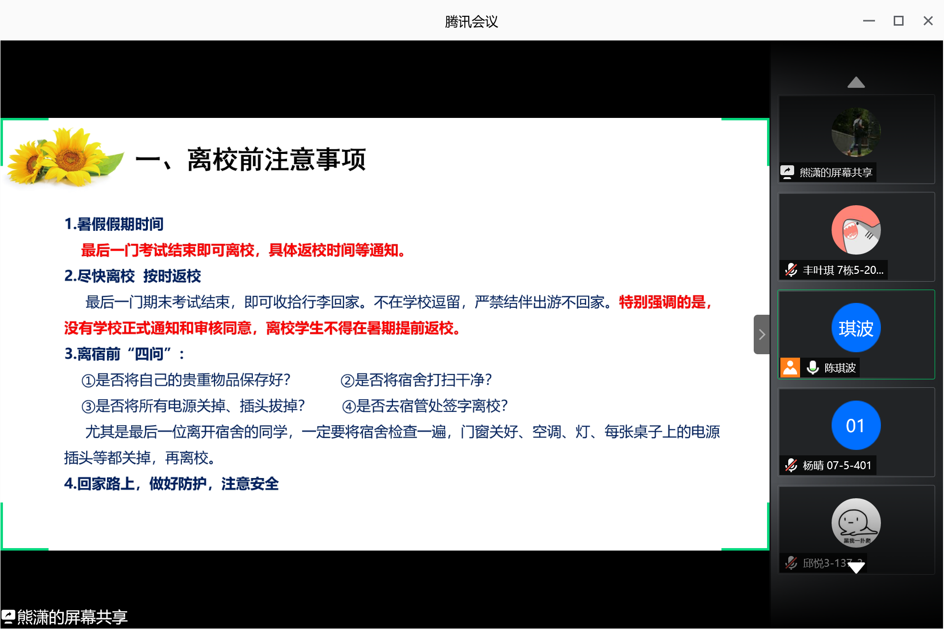 会上,陈老师详细强调了离校前注意事项,包括暑假起止时间、离宿前的“四问”、回家过程的防护安全等多个方面,并布置了暑假作业。此外,陈老师还为同学们列举了假期注意事项,希望同学们在欢度暑期的同时,能够注意自身安全、每日按时完成疫情防控打卡任务并完成暑假作业。熊老师着重提醒同学们踏实做好最后几门考试的复习准备,调整好考试心态,并针对同学们关于暑期社会实践活动的疑问进行了解答。