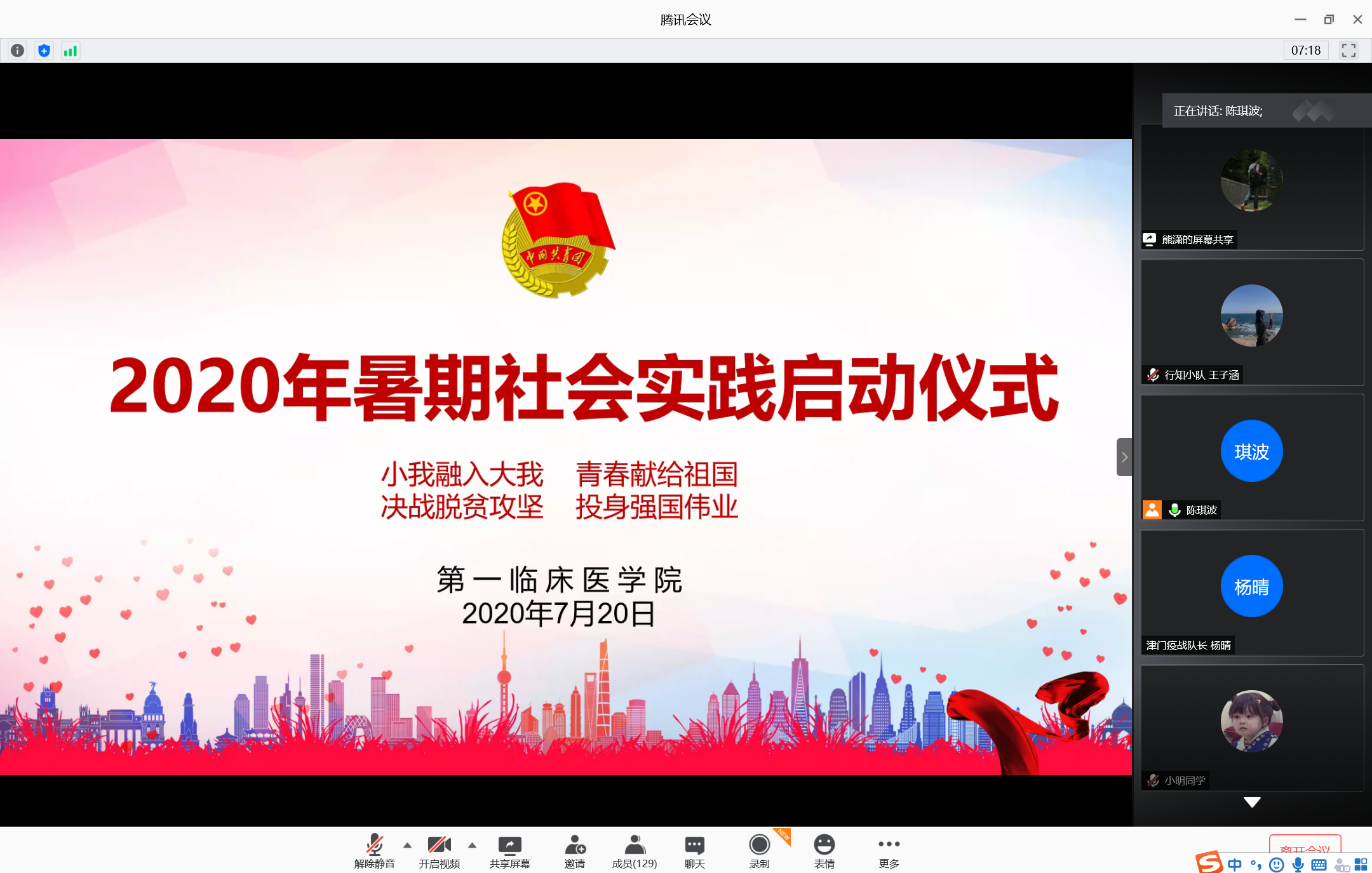 7月20日,第一临床医学院依托腾讯会议举行2020年暑期社会实践启动仪式。学院党委副书记、副院长盛彤彤、2018级辅导员熊潇老师、2019级辅导员张婷婷老师、学院新媒体中心主任丰叶琪同学、学院分团委实践部部长周朝菁同学和各团队队长、通讯员、安全员参加活动。活动由2018级辅导员陈琪波老师主持。