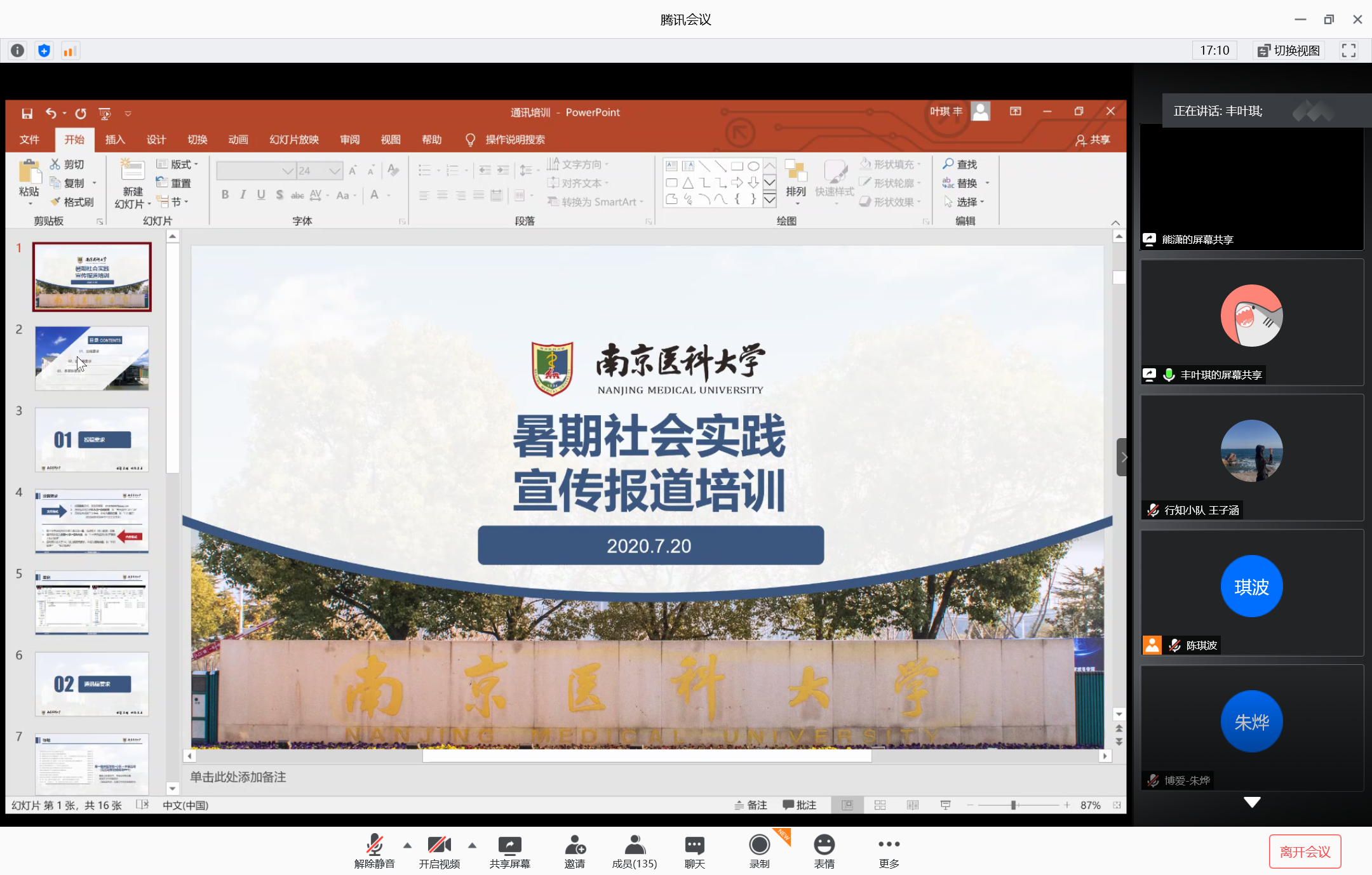启动仪式上熊潇老师宣读了组队情况,根据疫情防控需要和同学们成长发展需要,遵循突出主题、就近就便等实践原则,第一临床医学院最终确定了线上、线下49支实践队伍立项。随后,盛彤彤副书记为同学们做动员讲话,她强调暑期社会实践活动是学校和学院加强思想政治教育的重要途径,希望同学们围绕“小我融入大我,青春献给祖国;决战脱贫攻坚,投身强国伟业”的实践主题,发挥医学专业优势,提高自身综合素质,扩大社会影响力。随后,张婷婷老师、丰叶琪同学和周朝菁同学分别从安全、宣传报道和实践技能三个专题做培训,提醒同学们注意自身安全,注重材料收集,展示南医形象,提升综合素质。