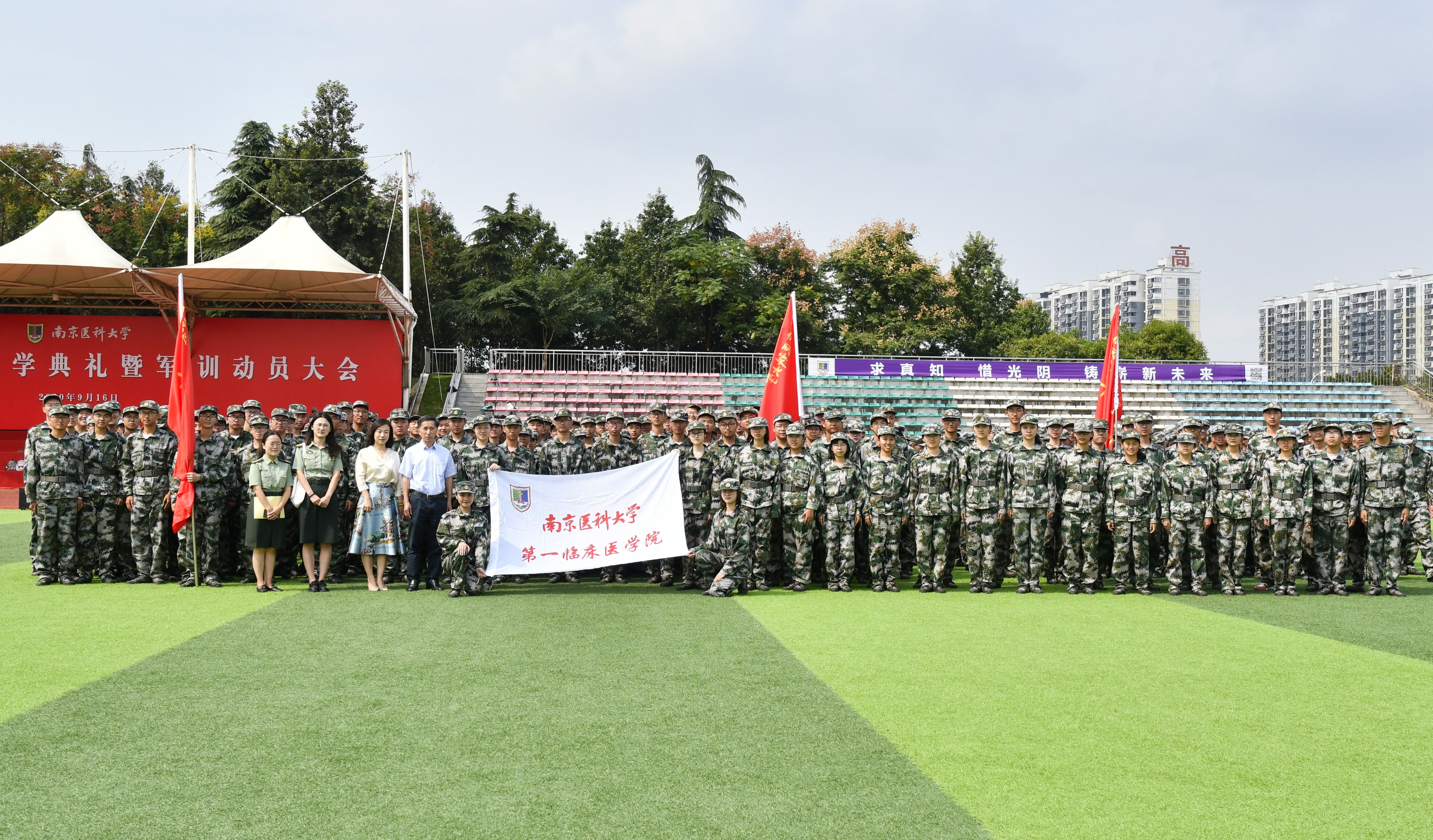 9月26日上午,第一临床医学院党委常务副书记苏荣健,副书记、副院长盛彤彤,学工办孟志娟、郑训迪老师慰问了第一临床医学院2020级军训新生。