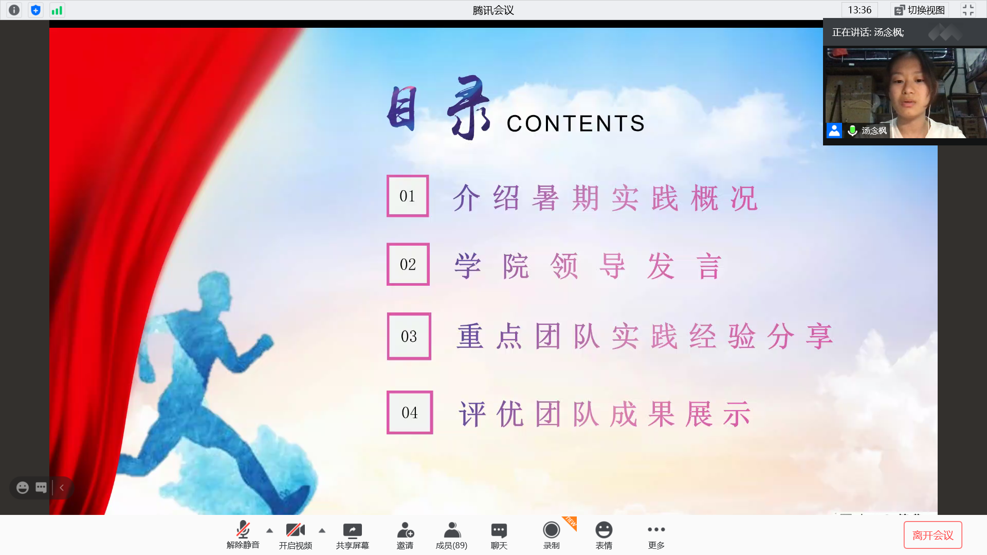 活动上,盛书记介绍了本次暑期社会实践活动的情况,强调了社会实践对于大学生综合素质发展的重要性,对积极参与的同学们表示了鼓励和赞扬。11支团队代表分别从实践背景、实践方式、实践效果等方面汇报实践成果。有团队关注疫情下人们的心理健康状况,有团队关注老年人的身心健康,也有团队参与招生宣传、脱贫攻坚调研等社会实践,可以说是各有千秋,主题多彩、形式多样,团队内分工明确、总结到位,充分展示了一临学子的风采。