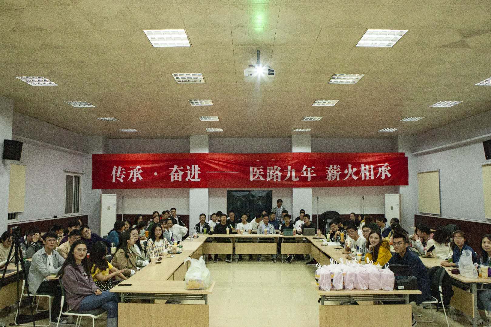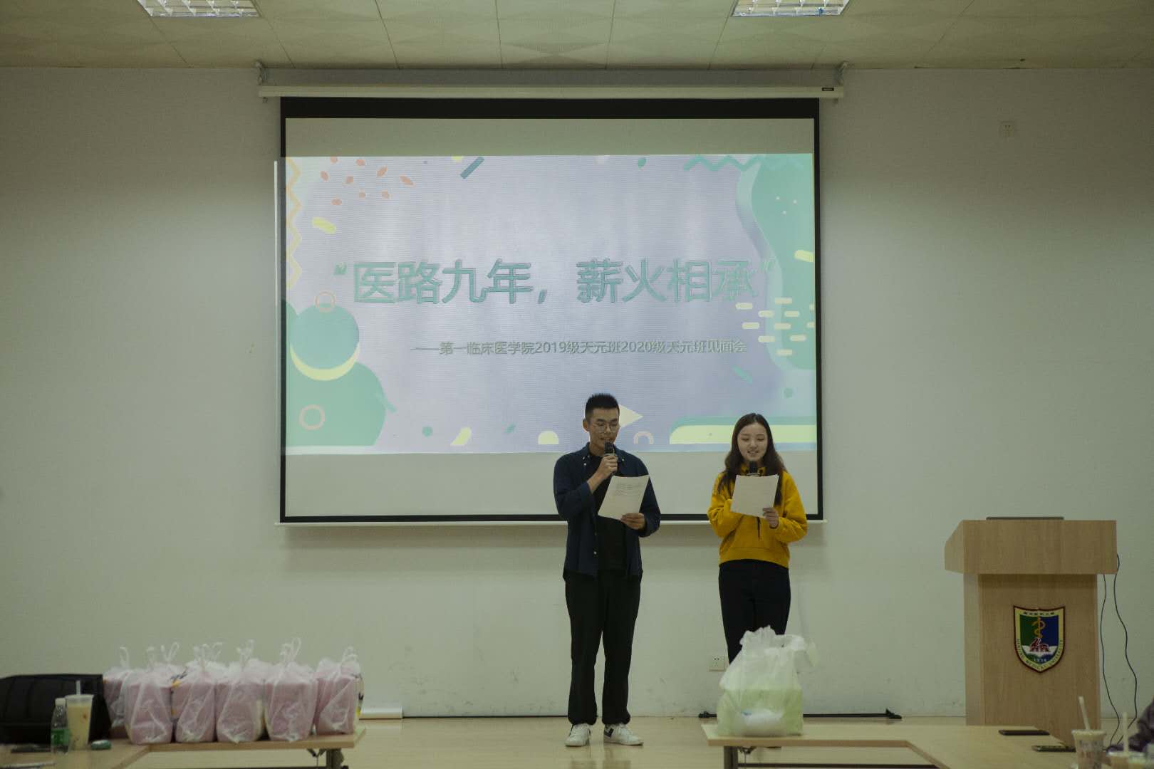 10月10日晚,在全校师生共庆南京医科大学86岁生日之际,第一临床医学院举办了以“传承·奋进—医路九年,薪火相承”为主题的19级和20级天元班见面会。出席本次活动的有天元班兼职班主任党旖旎、梁梦迪老师,20级辅导员郑训迪、孟志娟老师以及19级和20级全体天元班同学。见面会由许靖童、徐霖南两位同学主持。