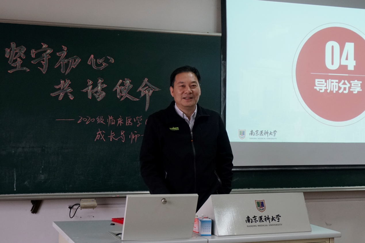 首先,班级组织委员杨轶星同学上台分享了入学以来的所思所感,以及对于未来的一些展望与困惑。他的发言引起了同学们的共鸣,也使得徐教授进一步了解了大家学习生活的情况。在大家期待已久的导师分享环节,徐教授就努力学习的重要性、制定计划与目标的必要性以及合作与沟通的关键性与同学们展开交流。他的讲话深刻又不失风趣,引人入胜且发人深省,教导同学们应在诚信为人的基础上精进学业,在切实可行的计划中做到劳逸结合,同时应注意培养沟通交流能力,努力成为一名全面发展的优秀医学生。