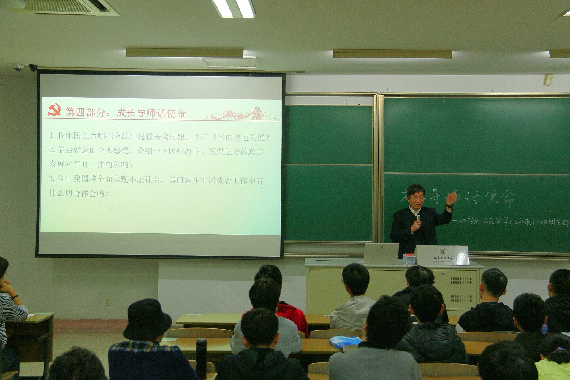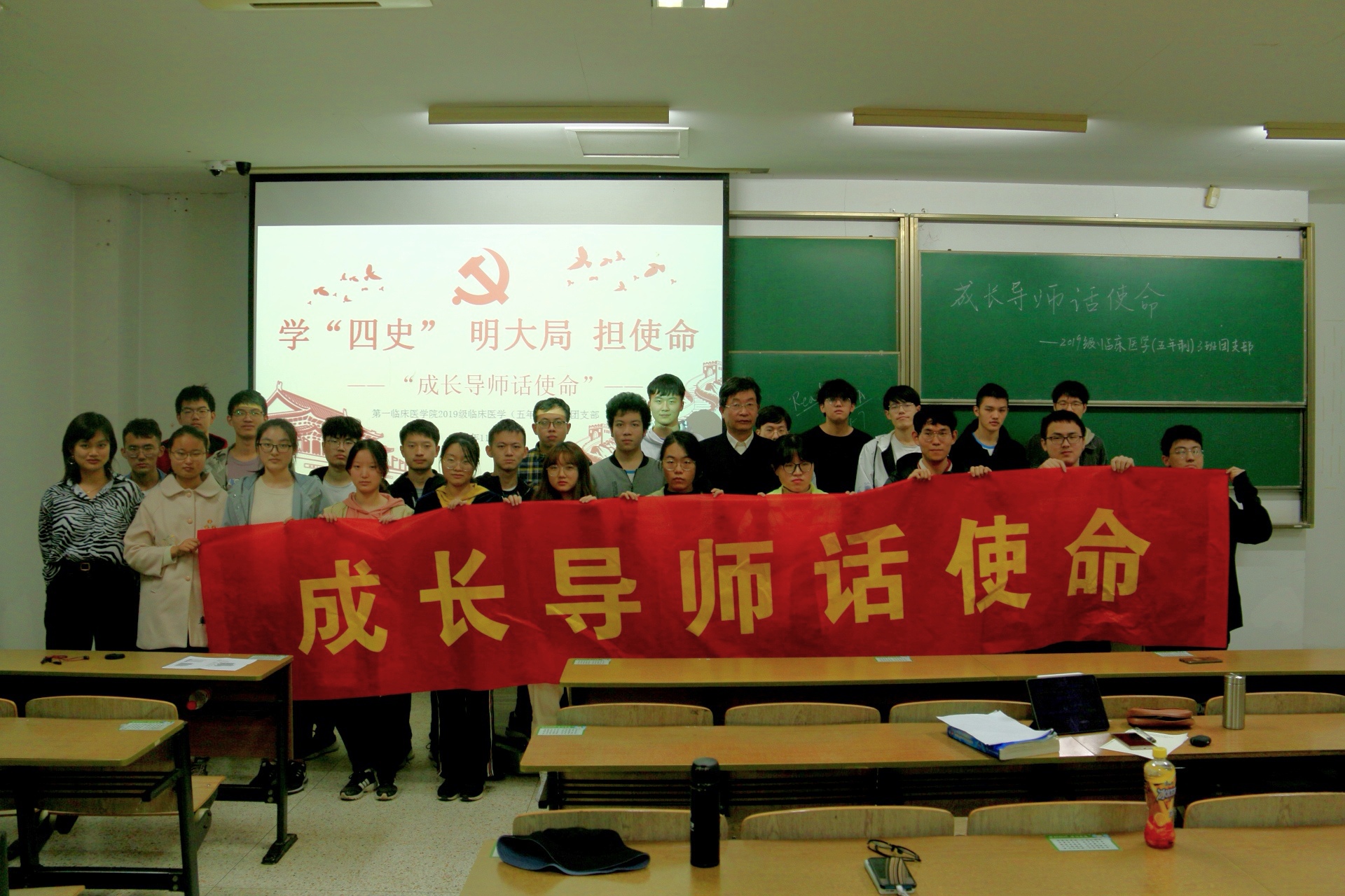 11月19日晚,第一临床医学院2019级临床医学五年制3班全体同学于明达楼k115开展“成长导师话使命”活动。本次活动邀请成长导师邢昌赢教授与同学们就“学‘四史’、明大局、担使命”三个方面进行亲切交流,活动由班长吴天诗同学主持。