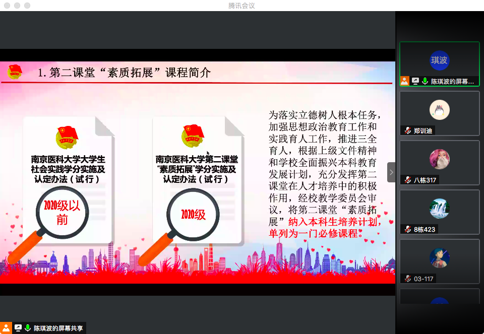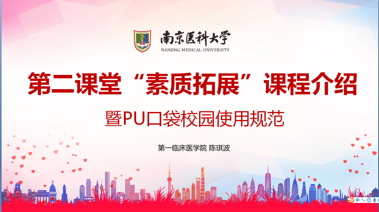 11月19日晚,第一临床医学院2020级学工办组织新生通过线上讲座的形式集中学习“第二课堂素质拓展课程介绍暨PU口袋校园使用规范”,由2018级辅导员陈琪波老师主讲,2020级新生在线参加。