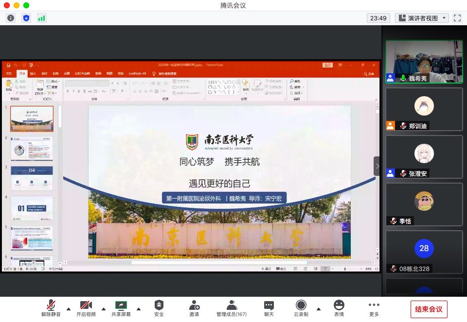 11月22日晚,为增强20级新生对于学术科研的认识,第一临床医学院通过腾讯会议开展“同心筑梦,携手共航” 20级学术专题线上交流会。参与本次活动的有20级辅导员郑训迪老师、20级泌尿外科硕士研究生魏希夷同学,以及20级所有五年制临床专业同学与部分5+3一体化临床专业及天元班同学。本次活动由张澄安同学主持。