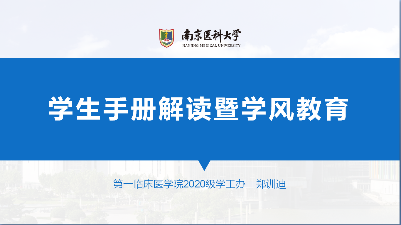 11月26日晚,第一临床医学院2020级学工办组织新生通过线上讲座的形式集中学习“新生学习学生手册解读暨学风教育”,由20级辅导员郑训迪老师主讲,2020级新生在线参加。