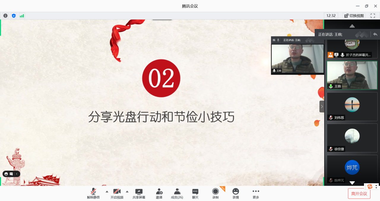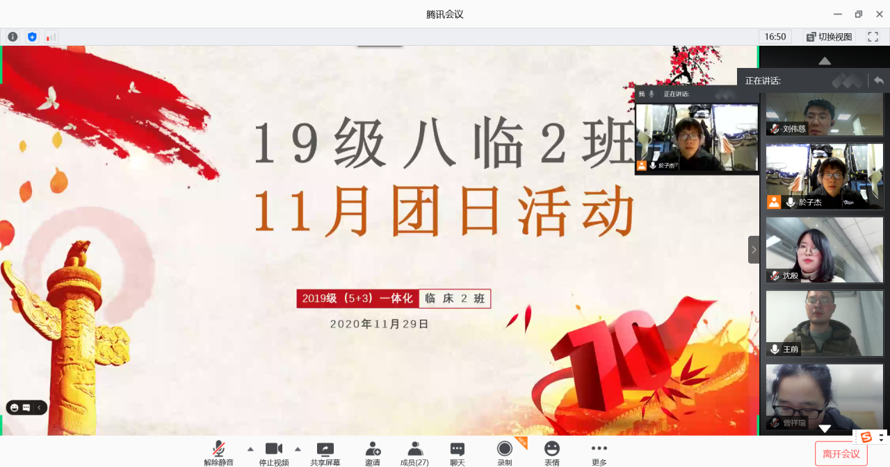 11月29日晚,2019级临床医学(5+3)一体化2班以线上会议的形式开展了“光盘行动 弘扬美德”的主题团日活动暨兼职班主任见面会。兼职班主任王前老师参和全班同学参与,本次活动分为了解光盘行动、分享光盘行动和节俭小技巧、讨论三个部分,由於子杰同学主持。
