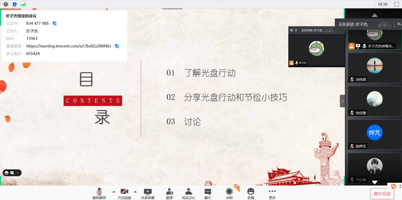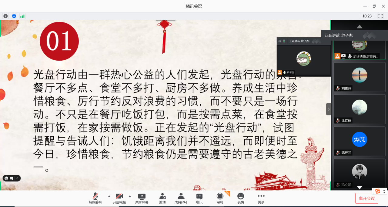 最后,在线上讨论的环节,杨薪琦同学代表发言,以他的亲身经历和真情实感向大家介绍了“光盘行动”的重要意义。同学们纷纷表示赞同,并热烈积极地加入讨论,一起探究“光盘行动”的必要性和重要性,现场气氛活跃。活动的最后,王前老师与同学们在线上合影留念。