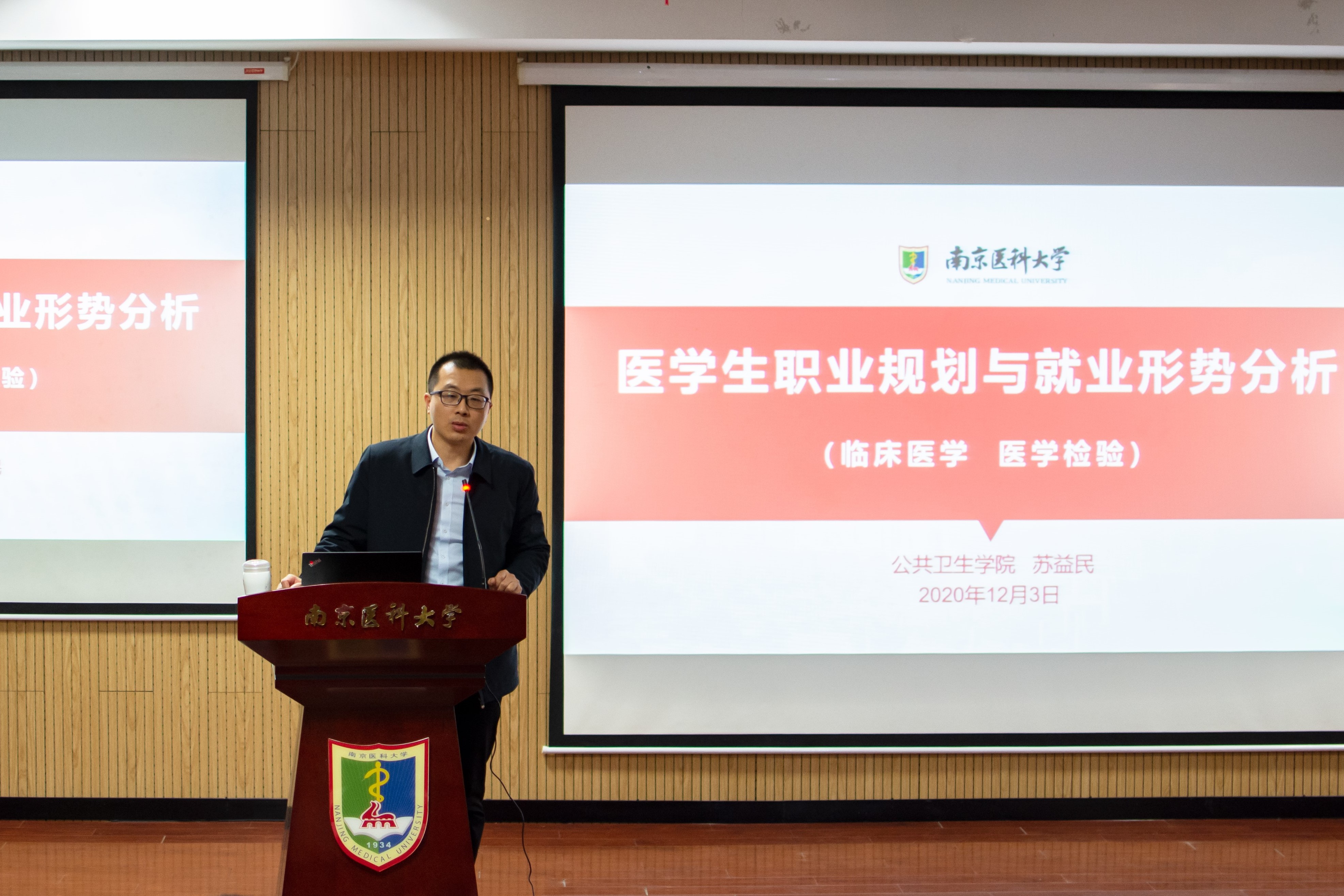 12月3日,学院邀请了公共卫生学院党委副书记、副院长苏益民老师为2018级学生开展“医学生职业规划与就业形势分析”就业创业指导专题课。苏老师以简明的语言,清晰而不繁杂的理论为同学们的生涯规划点亮起始的明灯。本次讲课由18级辅导员熊潇主持,年级全体同学参加。
