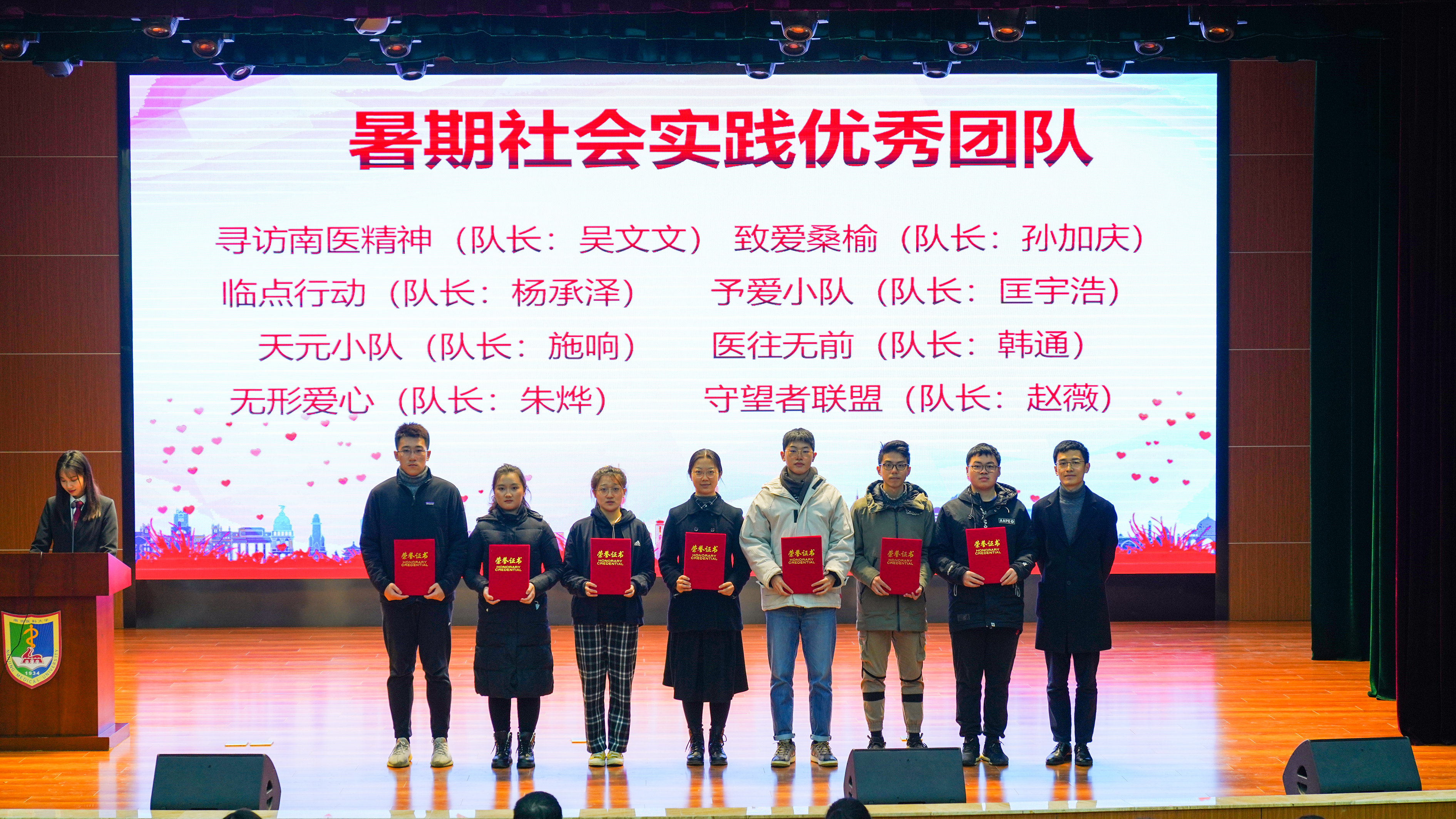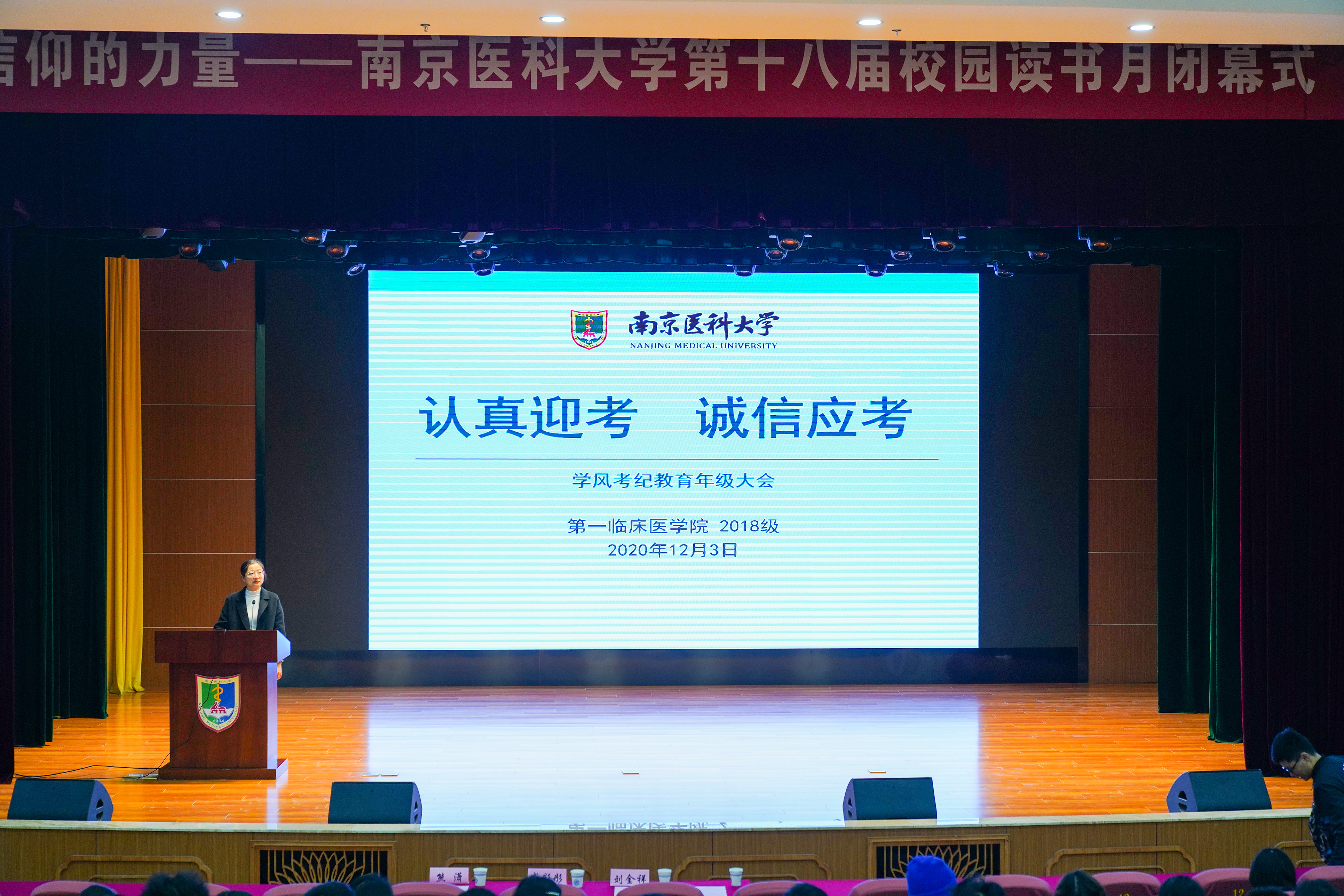 表彰大会上,总结回顾了一学年来2018级同学在学习、文体活动、暑期社会实践等方面取得的成绩。与会领导嘉宾为校优秀共青团员、校优秀学生干部、暑期社会实践优秀团队、暑期社会实践优秀个人、优秀读书笔记、特等奖学金、先进班集体、学风示范寝室、卫生优良寝室、运动会优秀运动员、运动会服务奉献奖等共计11个奖项的集体和个人颁奖。获奖代表,江苏省先进班集体获得者临床医学五年制3班班长汤君哲同学与校长奖学金获得者临床医学(5+3)一体化1班丰叶琪同学依次发言,分享班级和个人成长的故事表达对学校、学院领导老师培育的感谢。最后,学院党委副书记、副院长盛彤彤老师讲话,肯定了一临取得的成绩,18级同学的努力,表达了对同学们未来的期望。会前,陈老师还给同学们进行了学风考纪教育,并为同学们提供了诚信应考的小贴士,提醒同学们认真迎考、诚信应考。