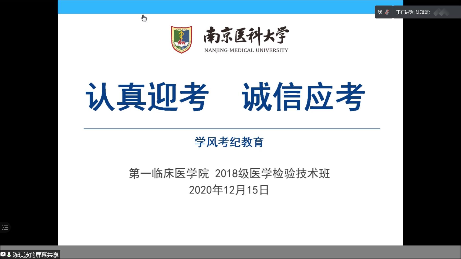 为进一步树立同学们诚信考试意识,加强学风考纪教育,12月15日,18级组织召开医检班学风考纪教育主题班会。班会由辅导员陈琪波老师主持,班级全体同学参加。