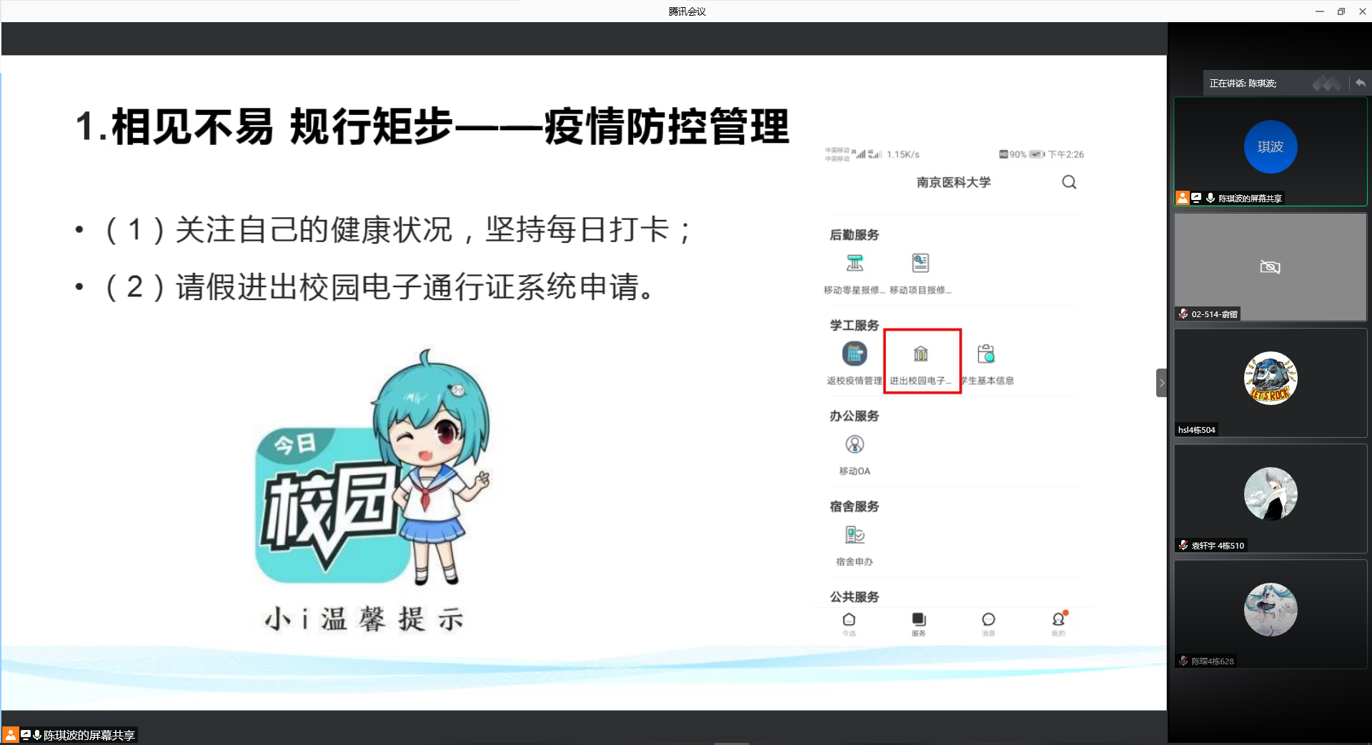 会上,陈老师强调了开学后疫情防控管理的相关要求,并就自助报到注册、开学第一课、作息调整、假期作业提交、成绩分析班会、补考准备、网络安全、校园地助学贷款等具体事宜进行了布置和提出要求,期待同学们以最好的状态面对新学期学习生活。