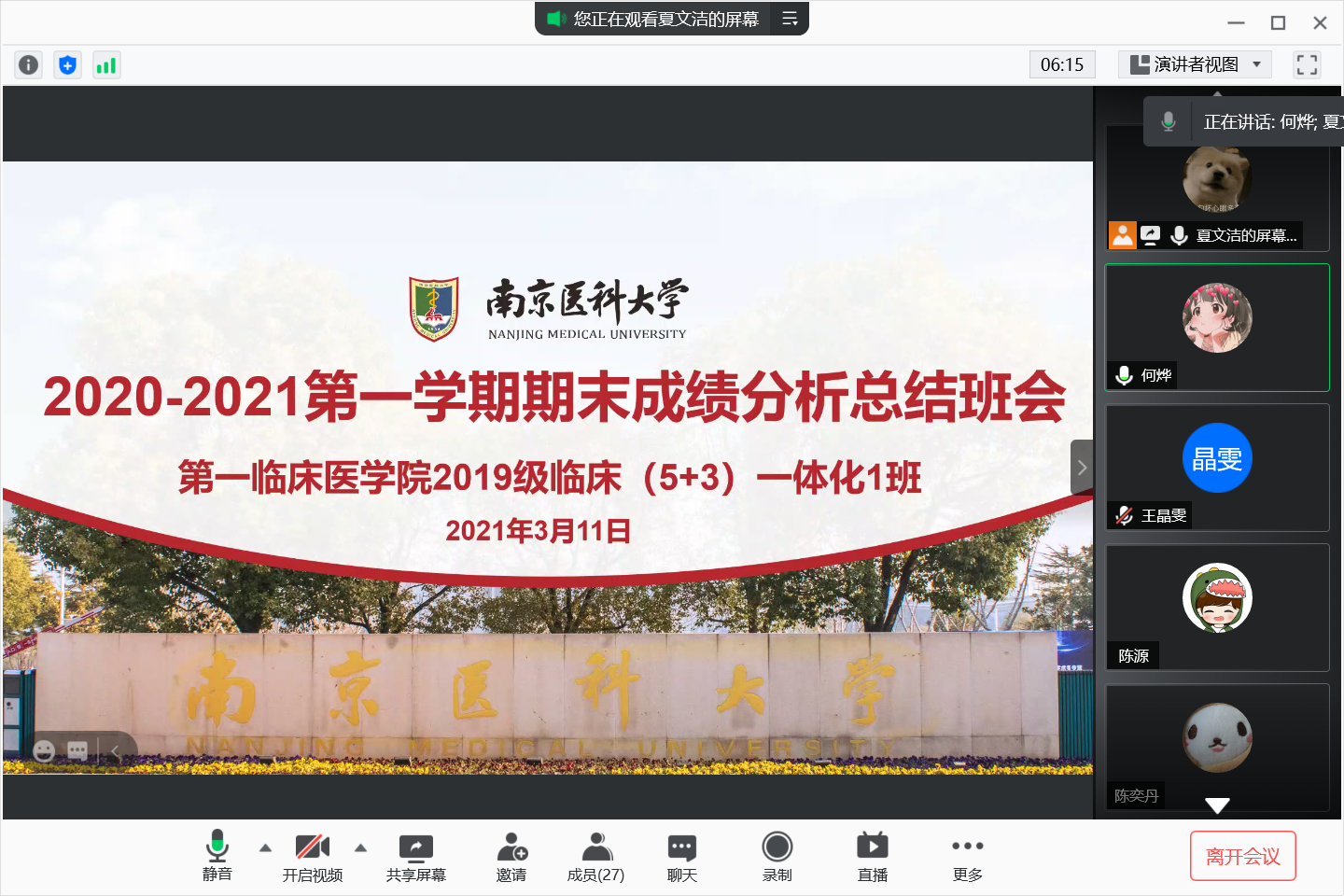 3月11日, 2019级临床(5+3)一体化1班同学积极参与了2020-2021学年第一学期期末成绩分析总结班会。会议由学习委员夏文洁同学主持,全班同学认真参与和交流学习感悟。
