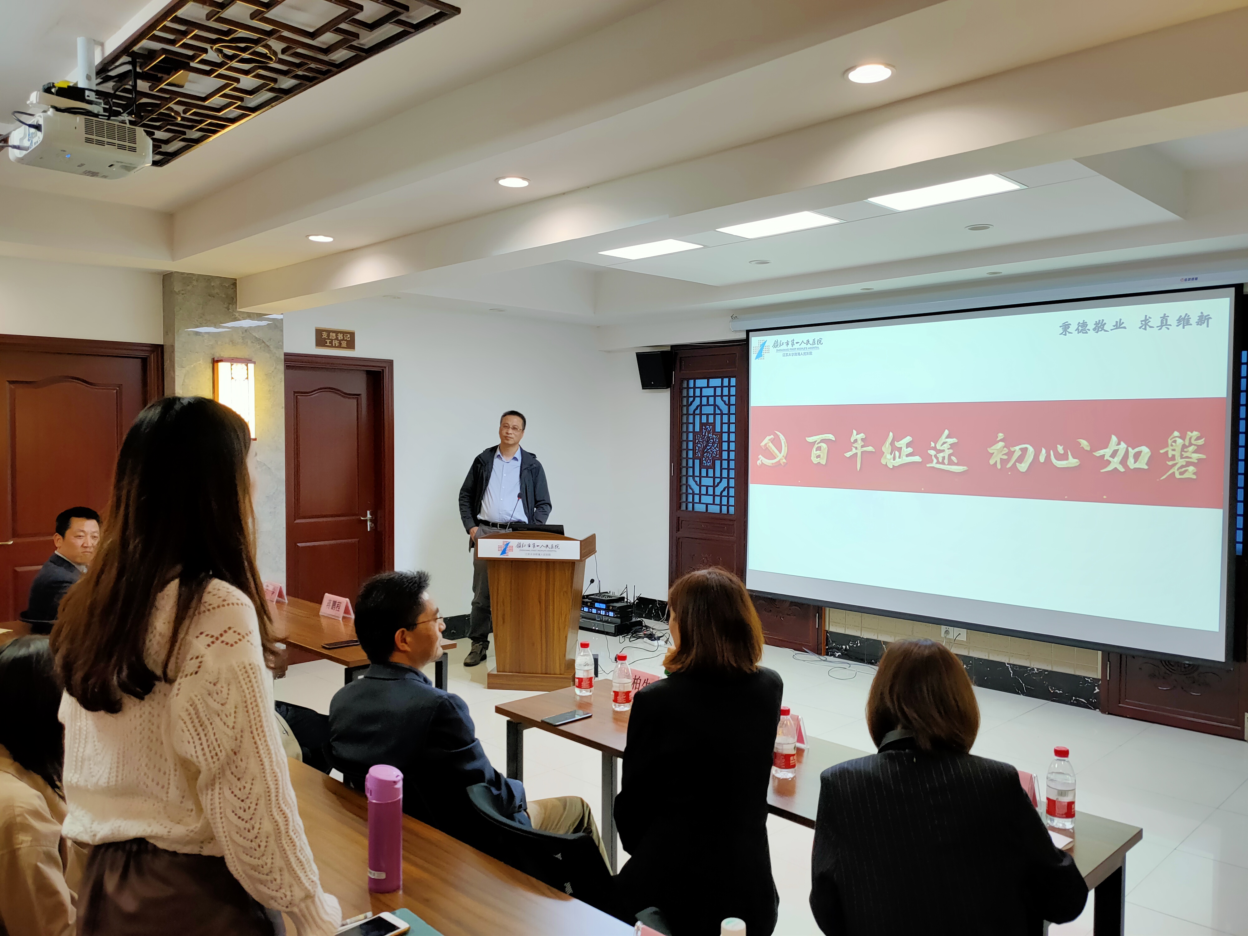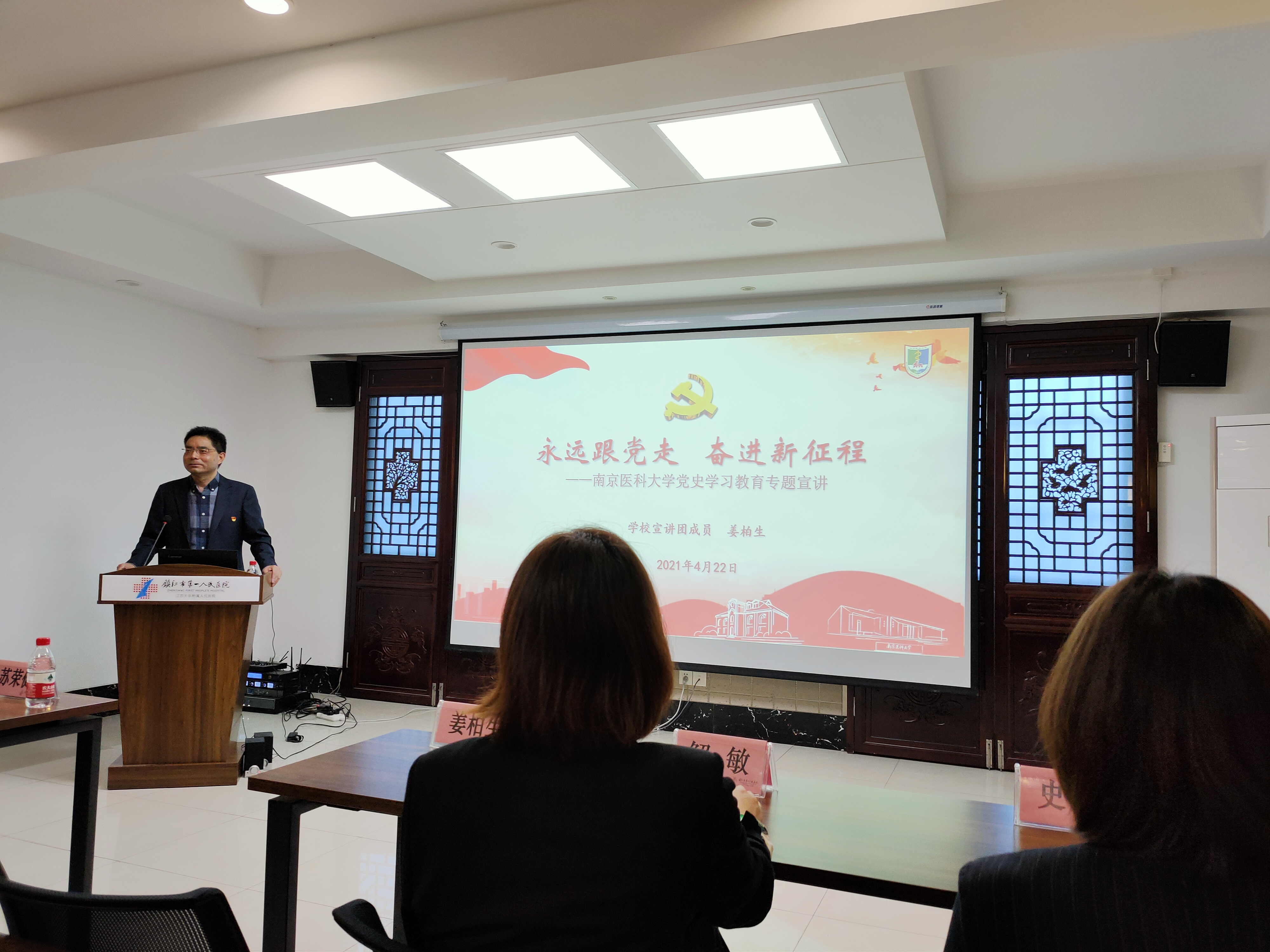 2021年4月22日下午,“学史明理 学史增信 学史崇德 学史力行——南京医科大学第一临床医学院党史学习教育‘进见习、实习点’”活动在镇江市第一人民医院正式启动。学校党史宣讲团成员、马克思主义学院姜柏生教授主讲,第一临床医学院党委常务副书记苏荣健、辅导员史怡君、秦冰,镇江市第一人民医院院长蒋鹏程、党办主任解敏、办公室主任学生党总支书记黄举、教科办主任柳迎昭、副主任张明,第一临床医学院临床医学五年制2016级实习生、2017级见习生参加了镇江站宣讲会。