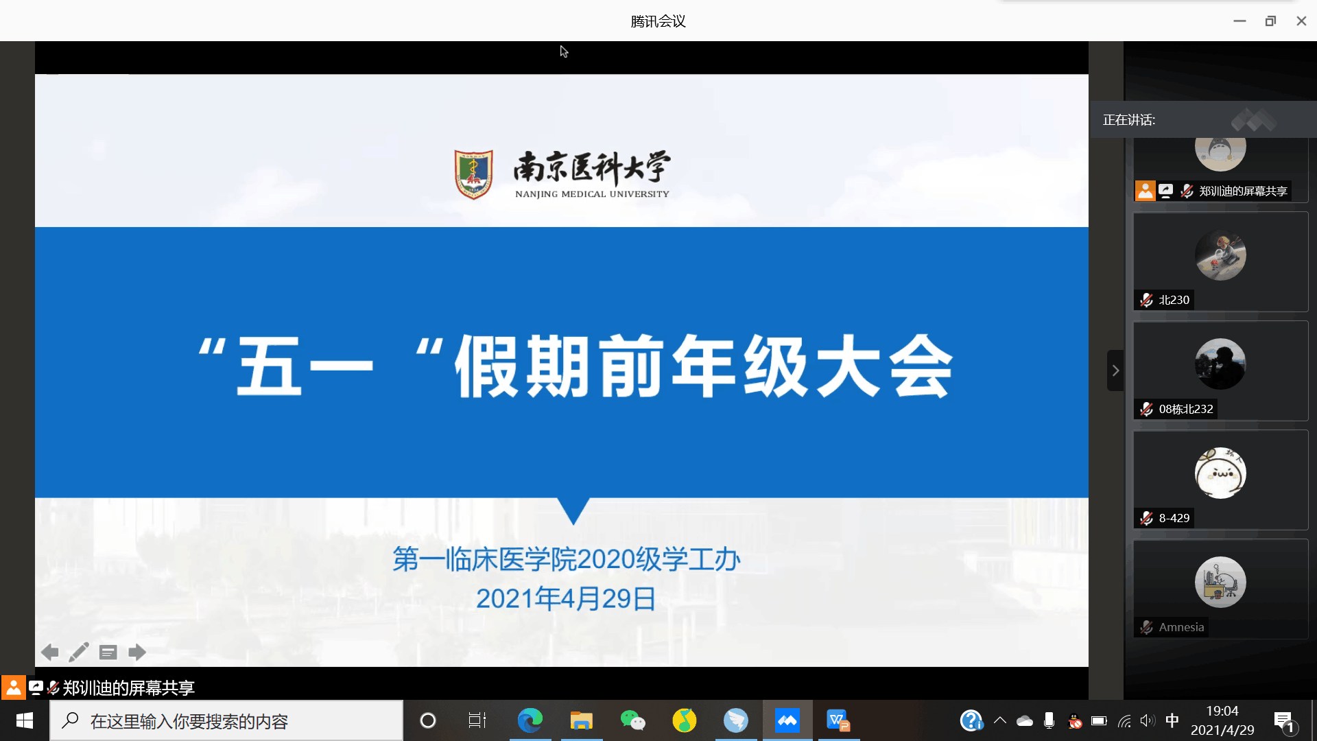 4月29日晚,第一临床医学院20级通过腾讯会议召开假期前年级大会。本次会议由20级辅导员郑训迪老师主持,叶馨,孟志娟老师及第一临床医学院2020级全体学生参会。