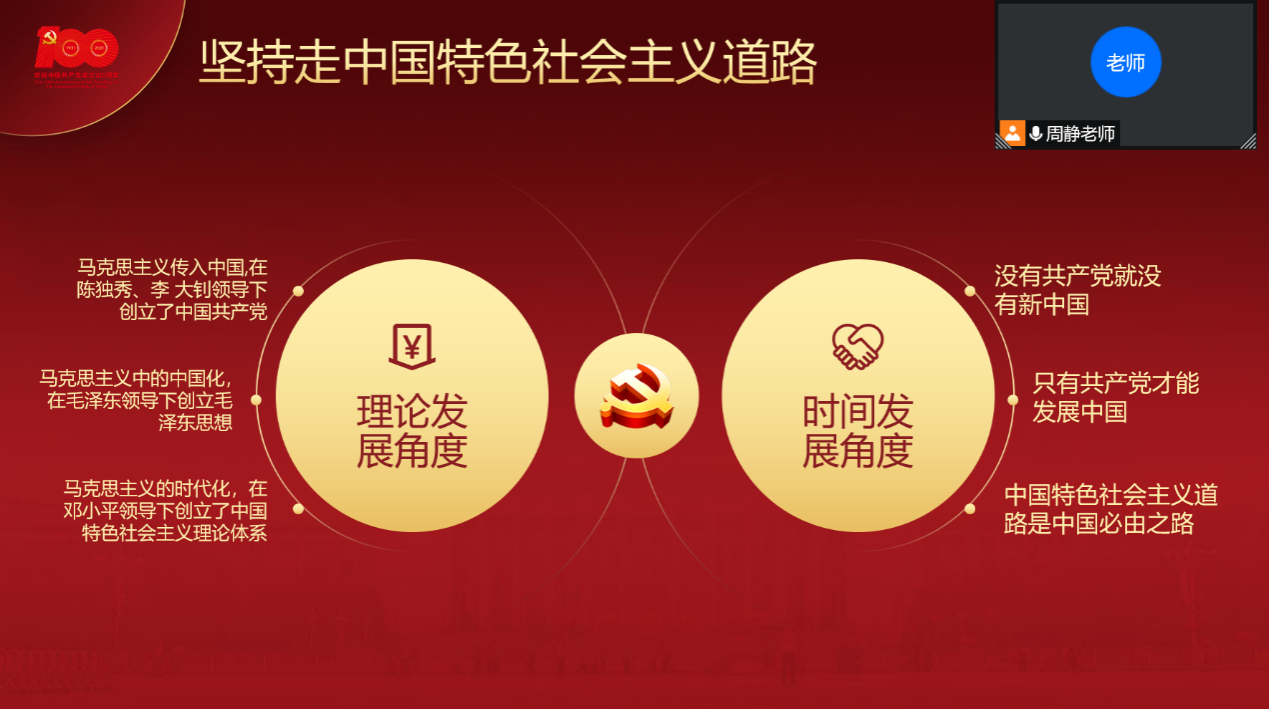 此次活动内容充实,形式丰富,主要分为三部分。首先开展回顾党的发展历程理论学习活动,从理论发展和时间发展角度介绍了坚持走中国特色社会主义道路的必然性和重要性。其次周静老师带领同学们赏析《觉醒年代》影视片段,最后周老师结合了自身前往湖北的抗疫经历,教导同学们要从党的光辉历程中接过奋斗的接力棒,心怀责任,脚踏实地做好本职工作。