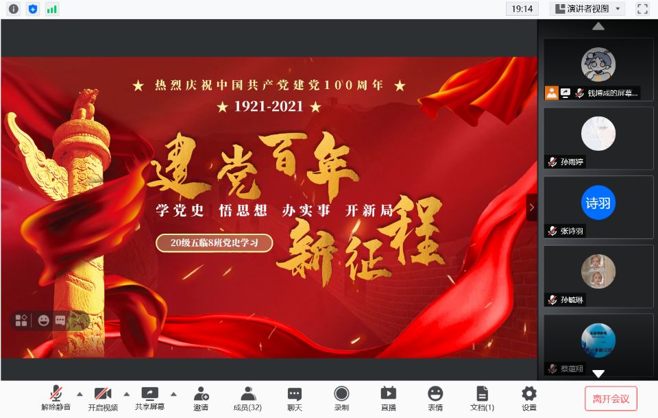 7月12日晚,2020级临床医学五年制8班组织召开“学党史,悟思想”线上活动,成长导师陈旭锋教授、五临8班全体同学参与,会议由班长钱博成同学主持。